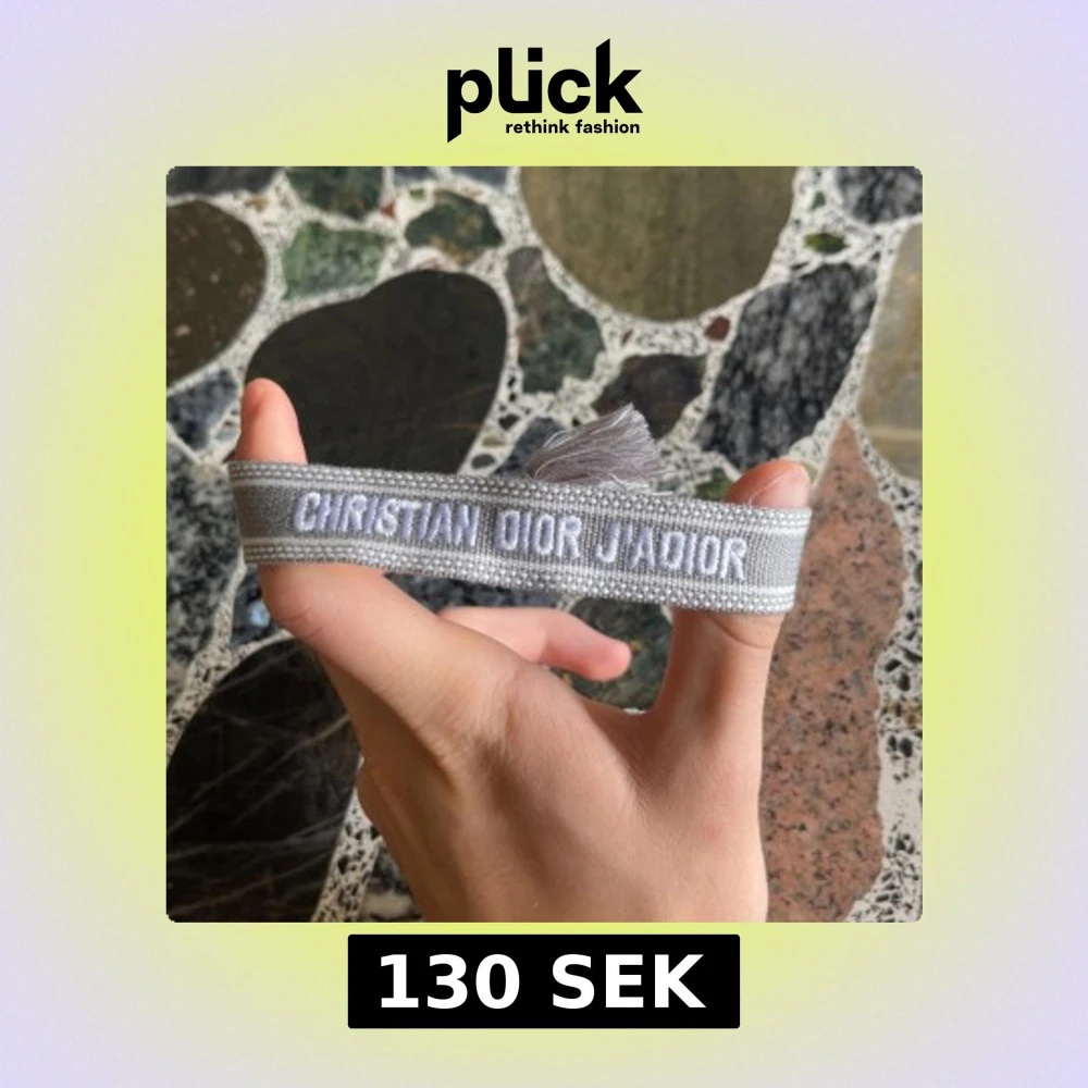 Snyggt grått armband från Christian Dior med broderad text 'J'Adior' i vitt. Armbandet har två dekorativa tofsar och är gjort i ett mjukt tygmaterial. Perfekt accessoar för att lyfta din outfit med lite lyxig vibe.