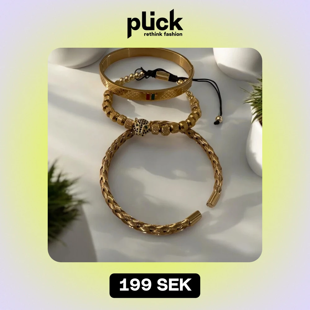 Säljer tre snygga guldfärg armband i olika stilar. Ett flätat armband med elegant design, ett justerbart armband med pärlor och ett coolt lejonhuvud, samt ett slätt armband med färgglada detaljer. Perfekta för att ge din outfit en lyxig touch!