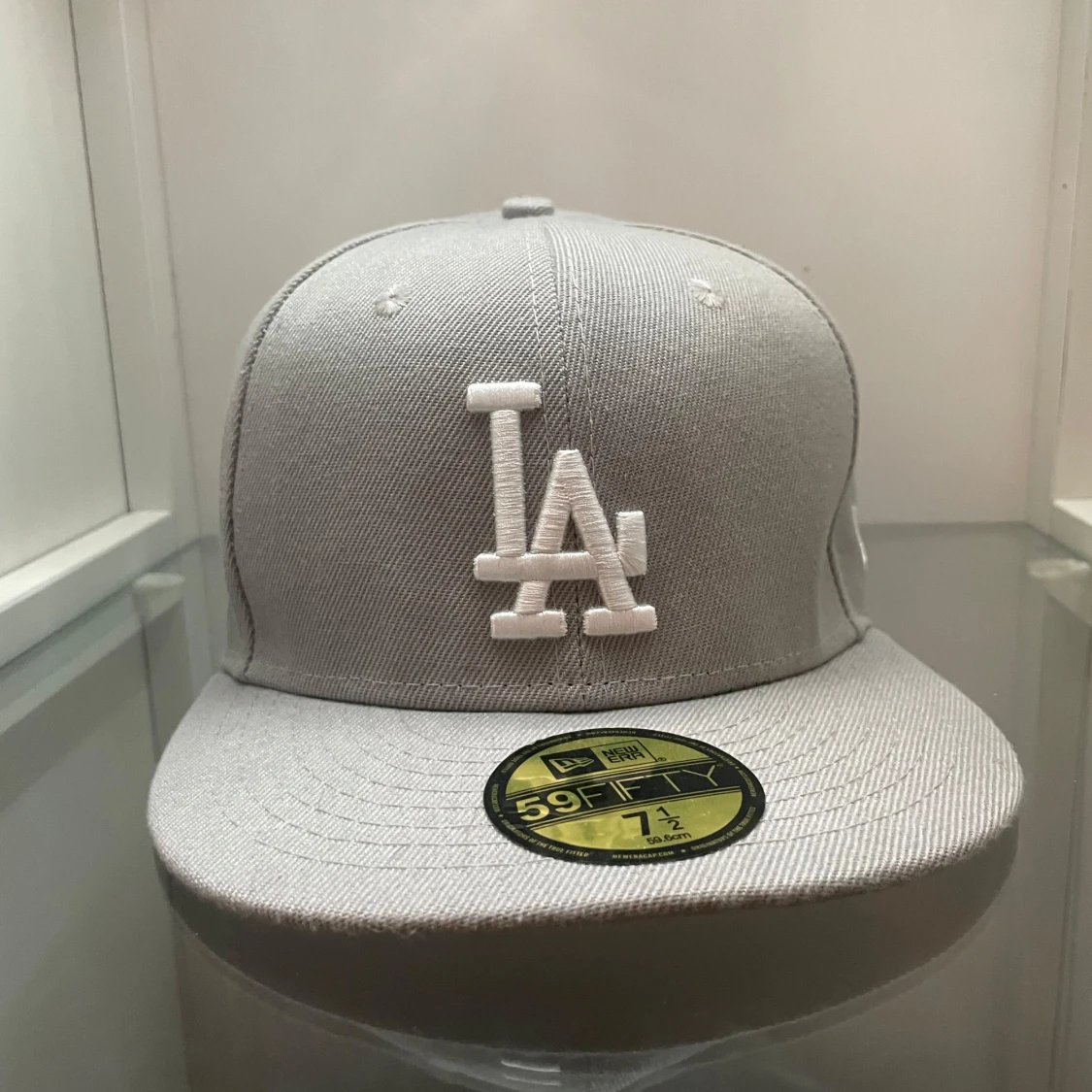 Snygg grå LA Dodgers keps från New Era 59FIFTY-serien. Kepsen har broderad LA-logga framtill. Rak skärm och klassisk passform. Tillverkad i polyester för en clean och modern look. Vet ej om den är äkta.