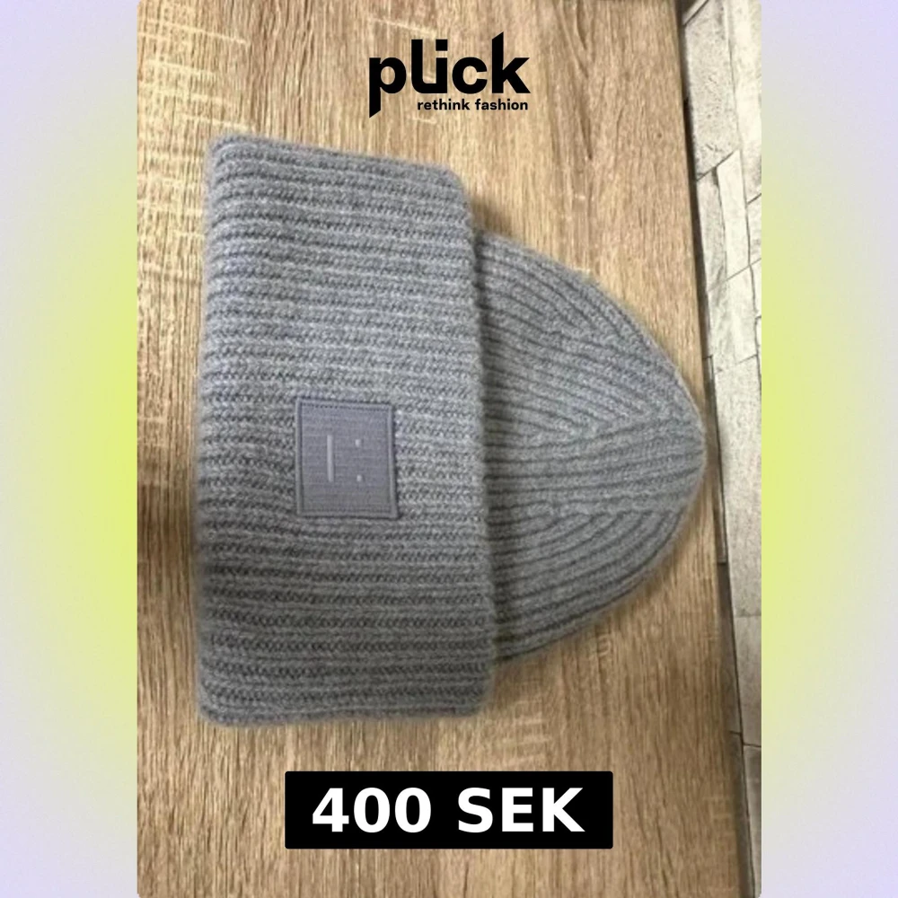 Snygg grå mössa från Acne Studios med ribbad stickning och klassisk logopatch framtill. Perfekt för kalla dagar och ger en clean look. Materialet är mjukt och värmande, och mössan har en bred uppvikt kant för extra stil.