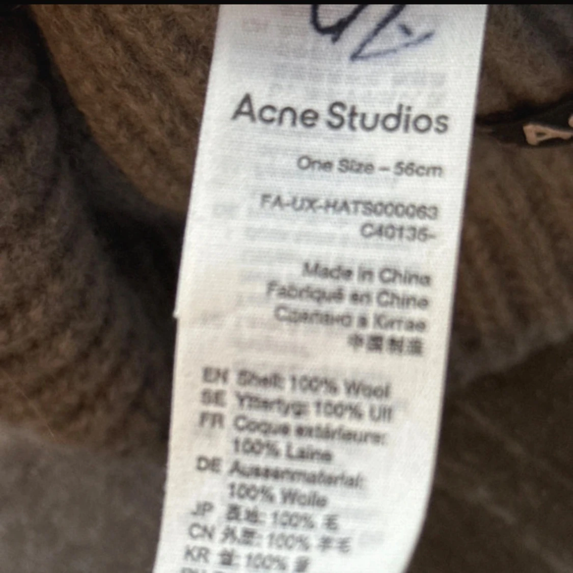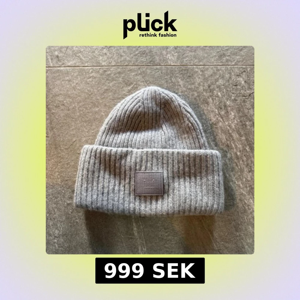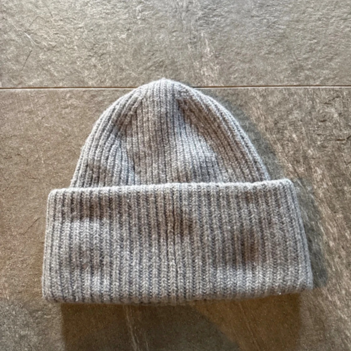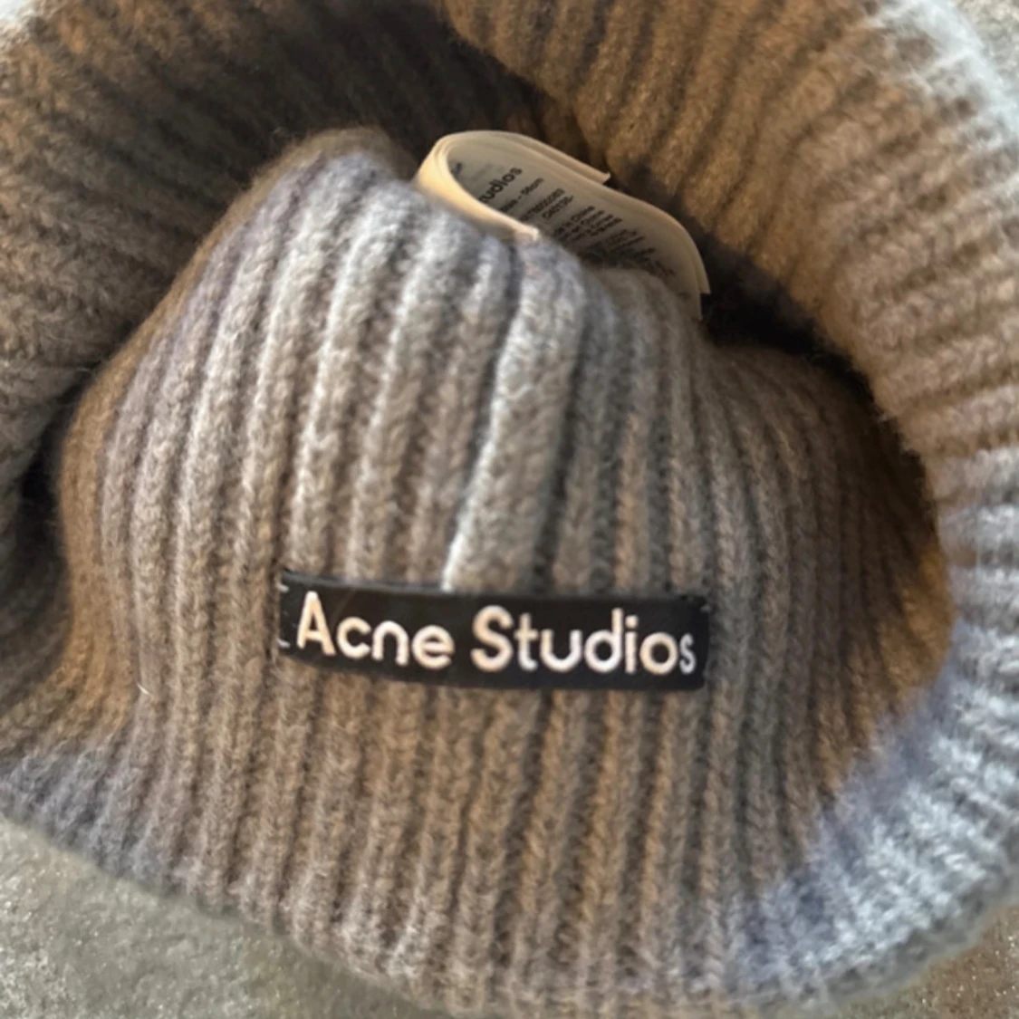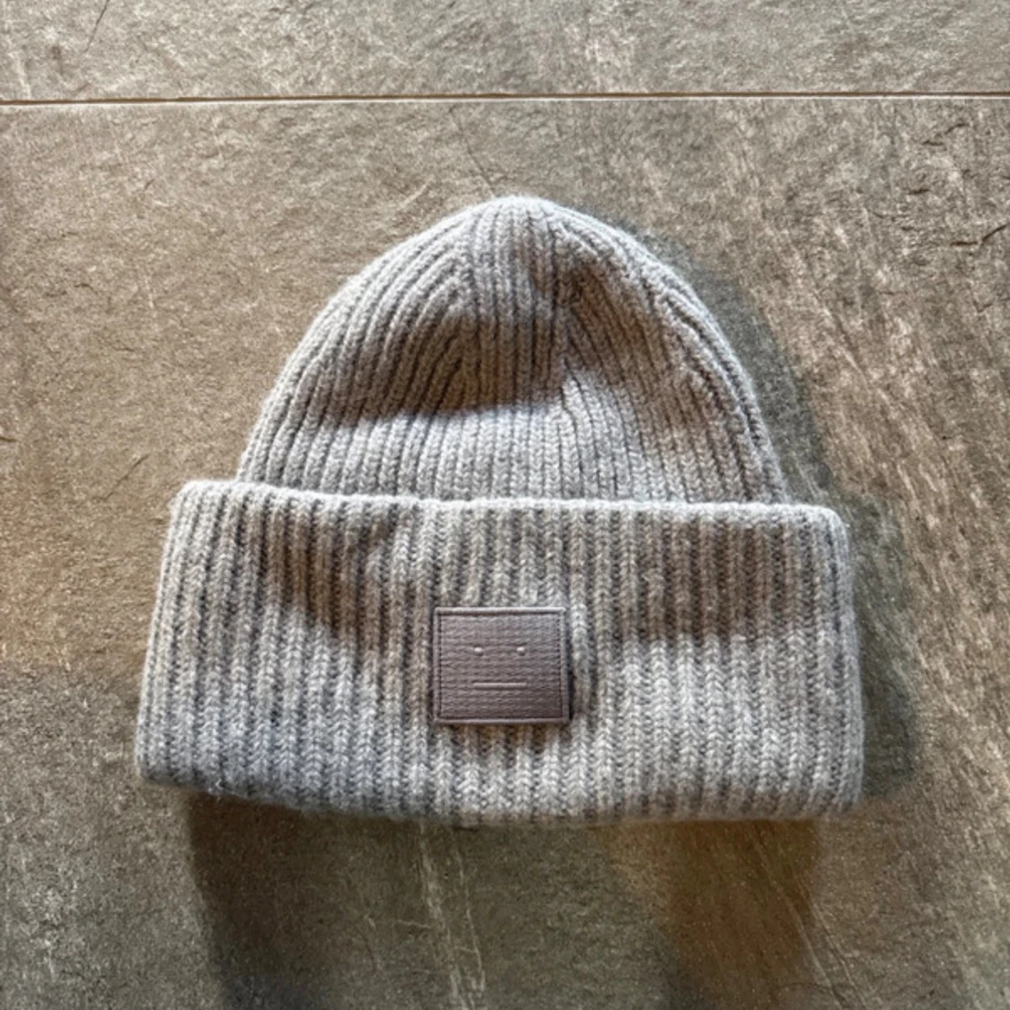 Säljer en grå ribbstickad mössa från Acne Studios med klassisk uppvikt kant och den ikoniska Acne Studios-loggan framtill. Mössan är tillverkad i mjukt ullmaterial och har en enkel, stilren design som passar perfekt till kalla dagar.