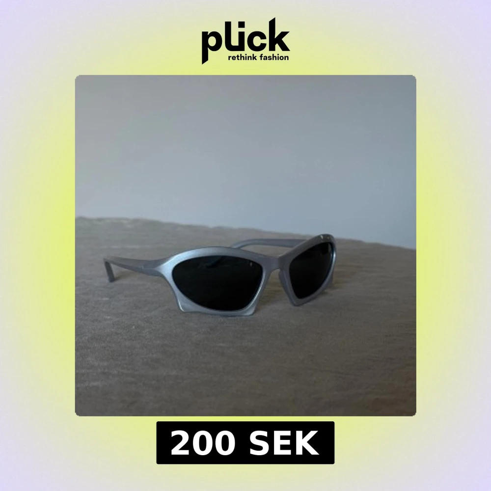 Snygga solglasögon med silvrigt, plastigt cat-eye båge och svarta linser. Den futuristiska formen ger en cool vibe och passar dig som vill sticka ut. Perfekt accessoar för att lyfta din stil med en modern touch. Aldrig använda.