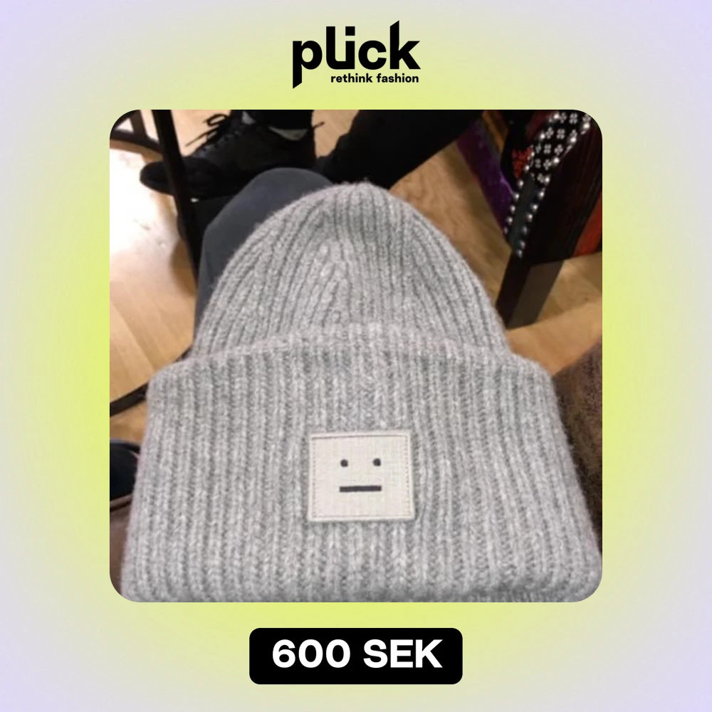 Säljer en superfin grå stickad mössa från Acne Studios. Den har en ribbad design och ett broderat ansikte framtill som ger en cool look. Perfekt för att hålla sig varm och stilren under kyliga dagar. Passar till det mesta i garderoben!
