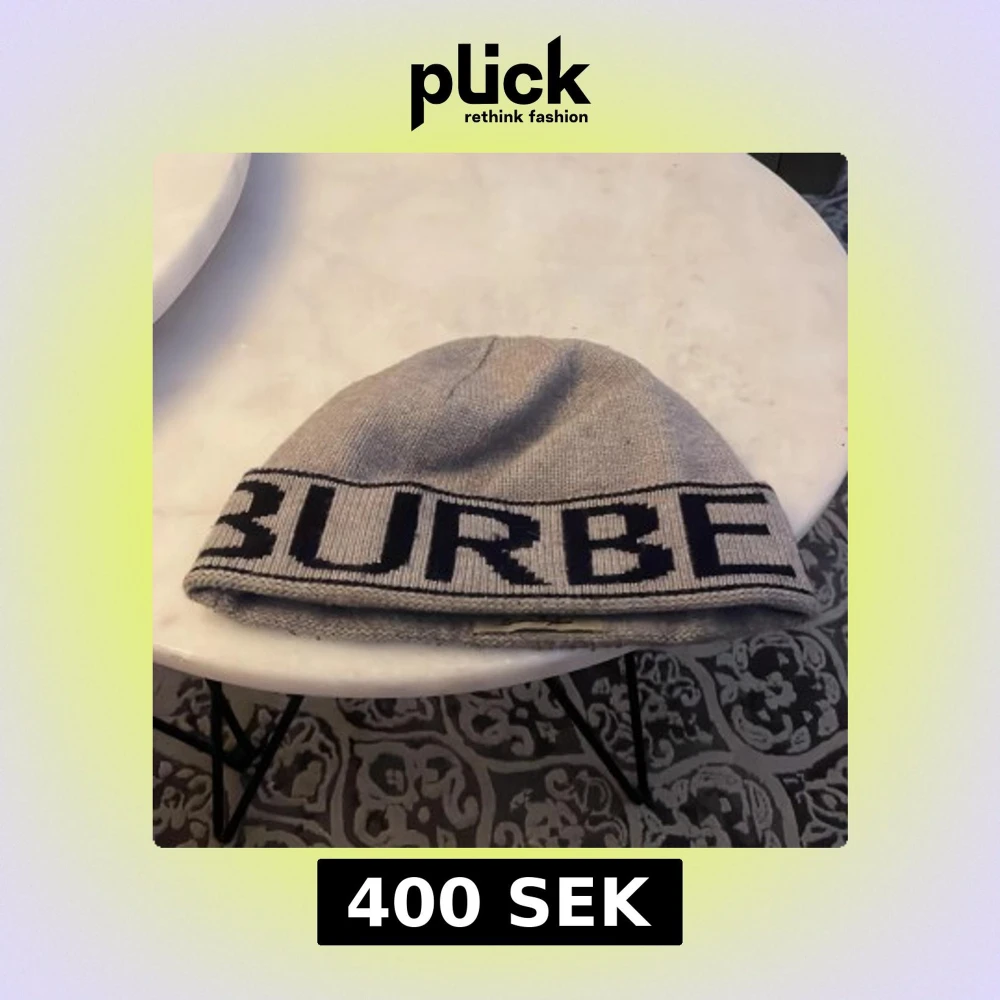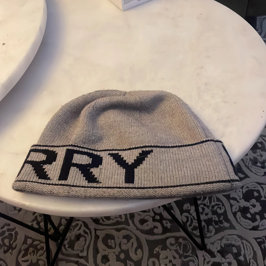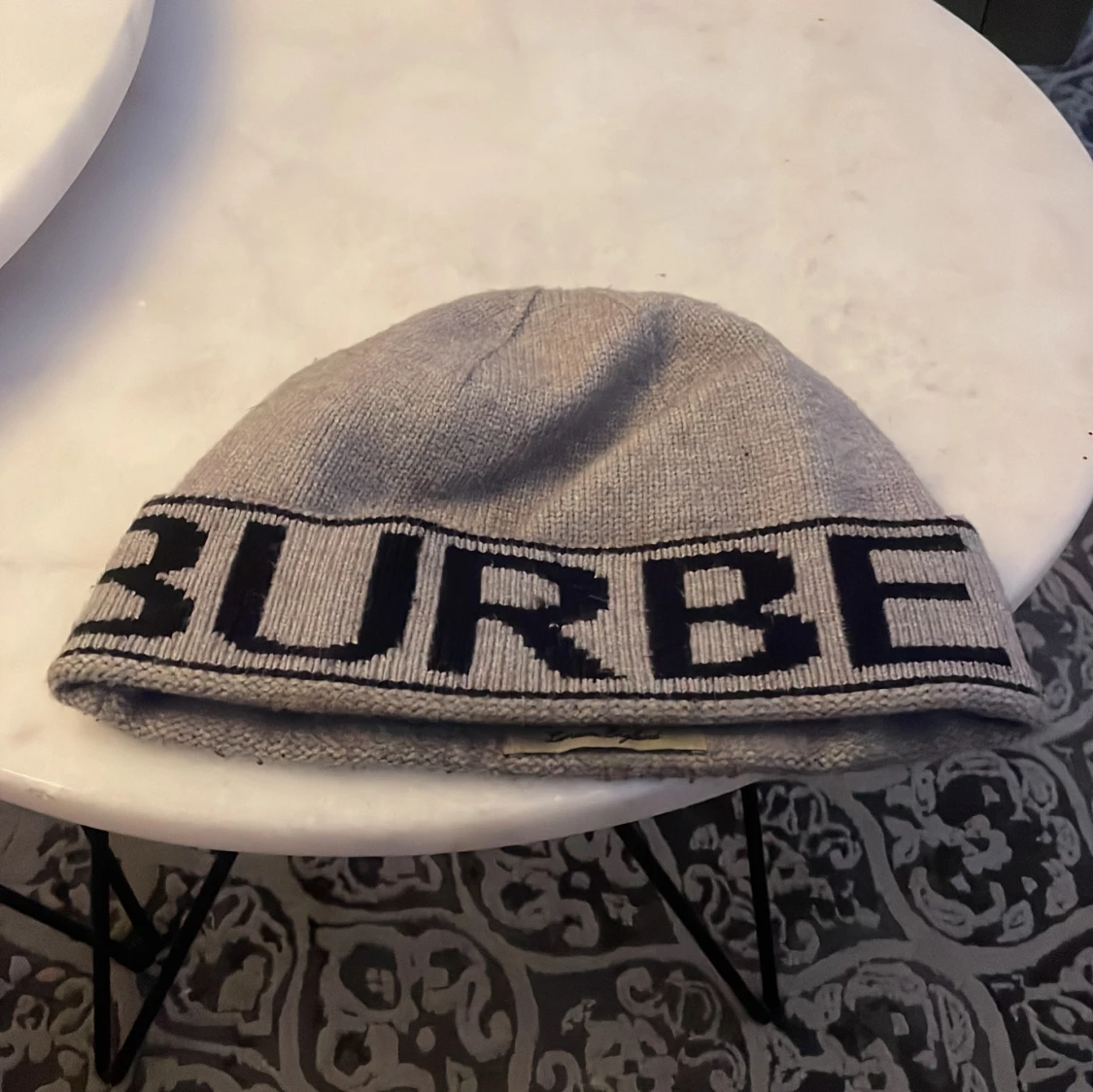 Snygg grå stickad mössa från Burberry med svart logotyp runt hela kanten. Klassisk och enkel design med tydlig Burberry-text och mjukt material som håller dig varm. Perfekt accessoar för att lyfta din vinterstil.