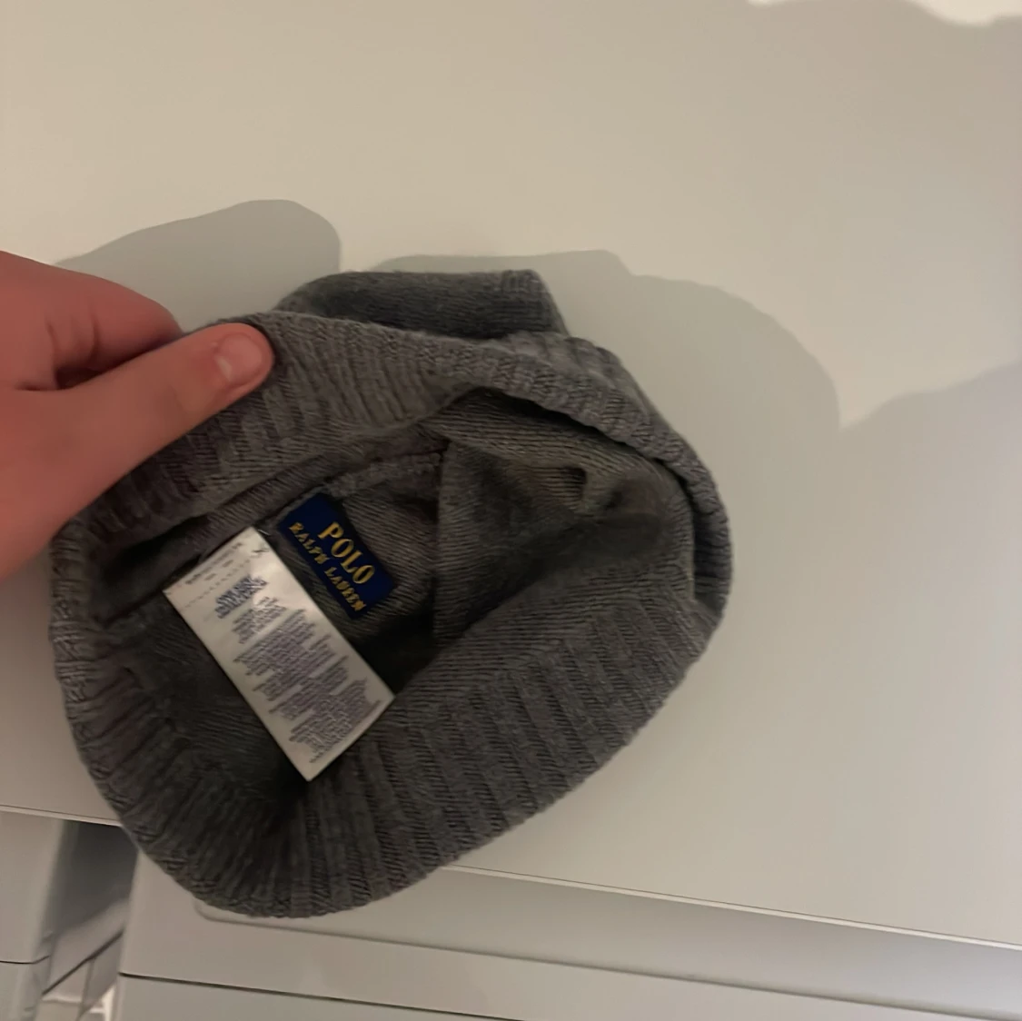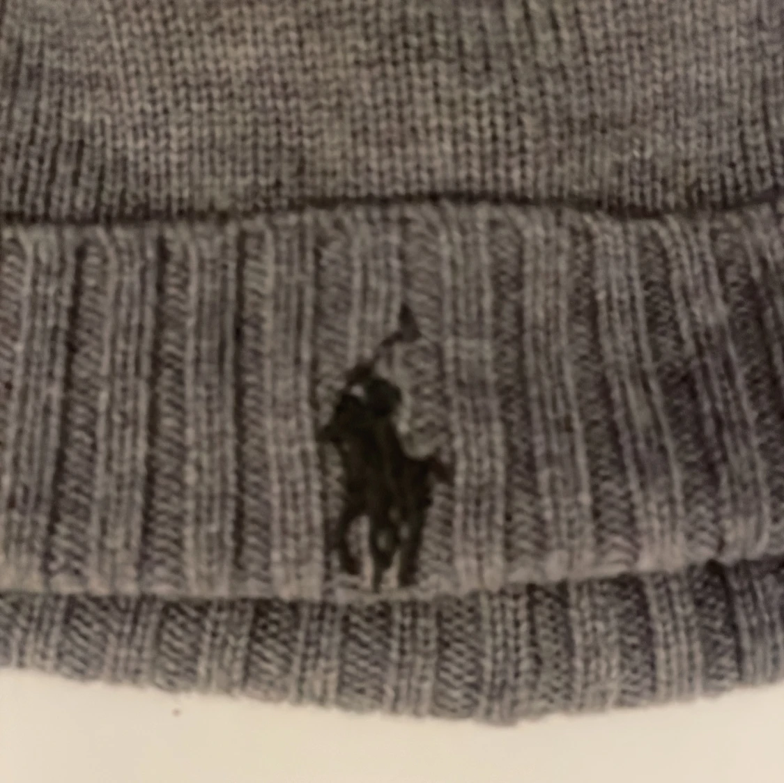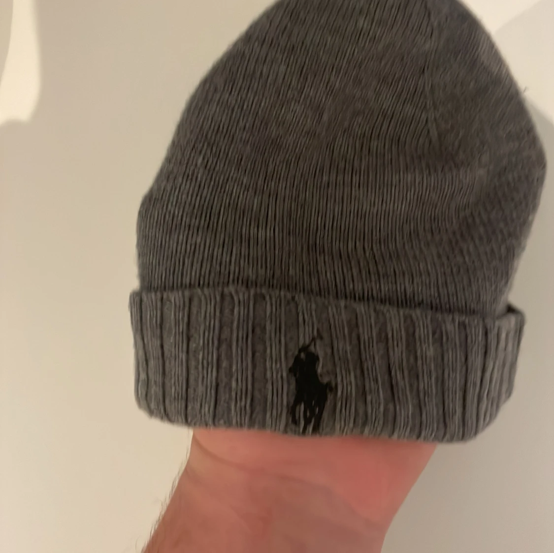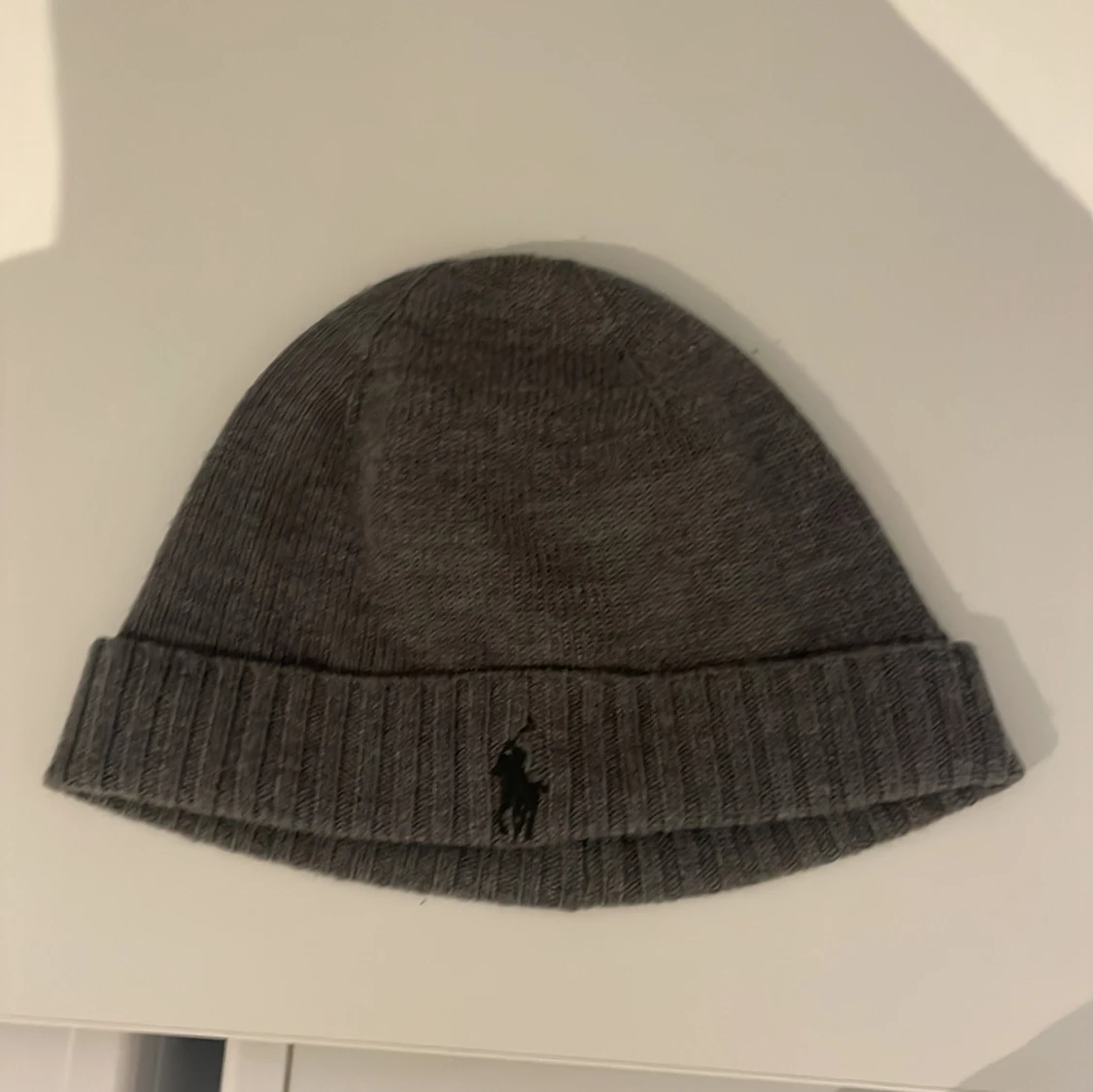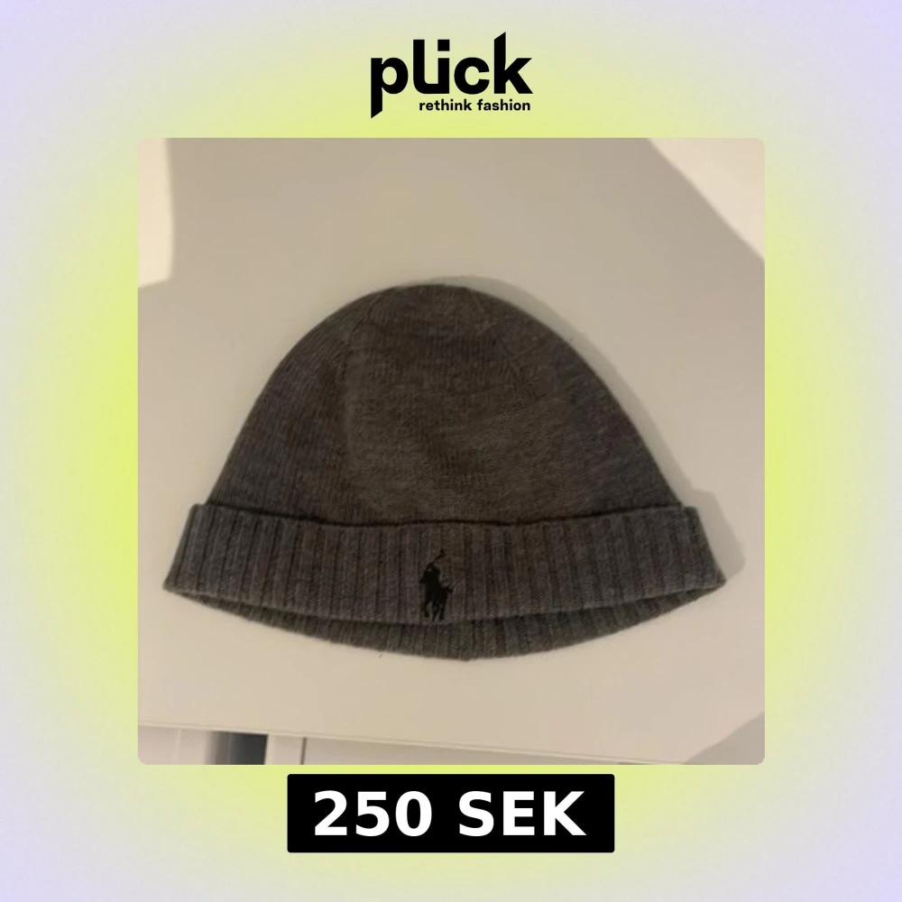 Snygg grå stickad mössa från Ralph Lauren med broderad logotyp framtill. Perfekt för kyliga dagar. Säljer denna mössa för att jag hitta min gamla mössa därför har ingen användning