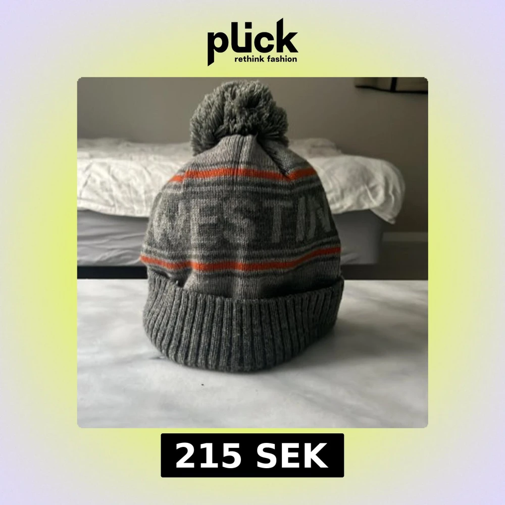 Snygg grå stickad mössa från Westin med bred uppvikt kant och stor tofs på toppen. Mössan har diskreta orangea ränder och texten 'Westin' i mönstret. Perfekt för kalla dagar och ger en chill vibe till din outfit. Bara skriva om du är intresserad.😊
