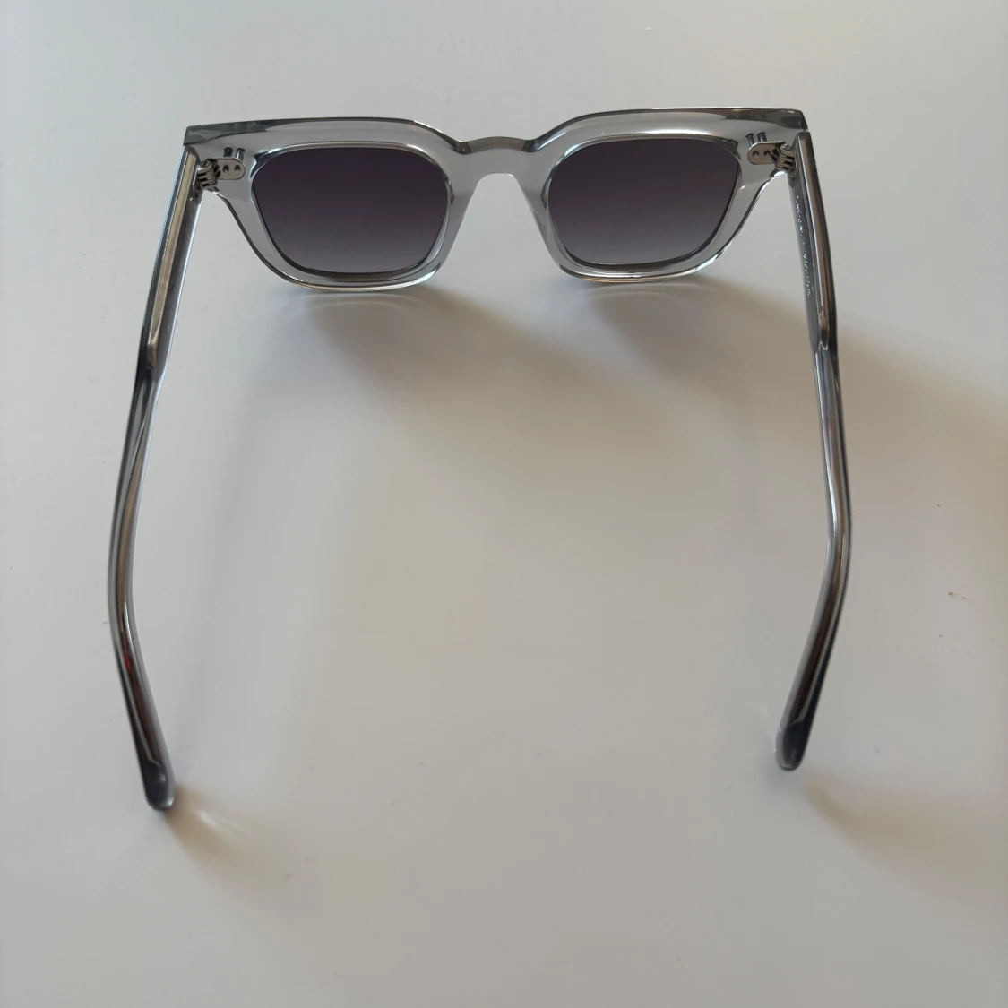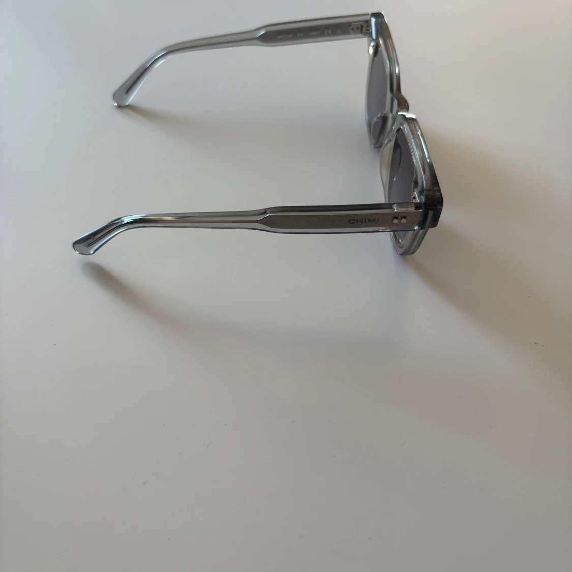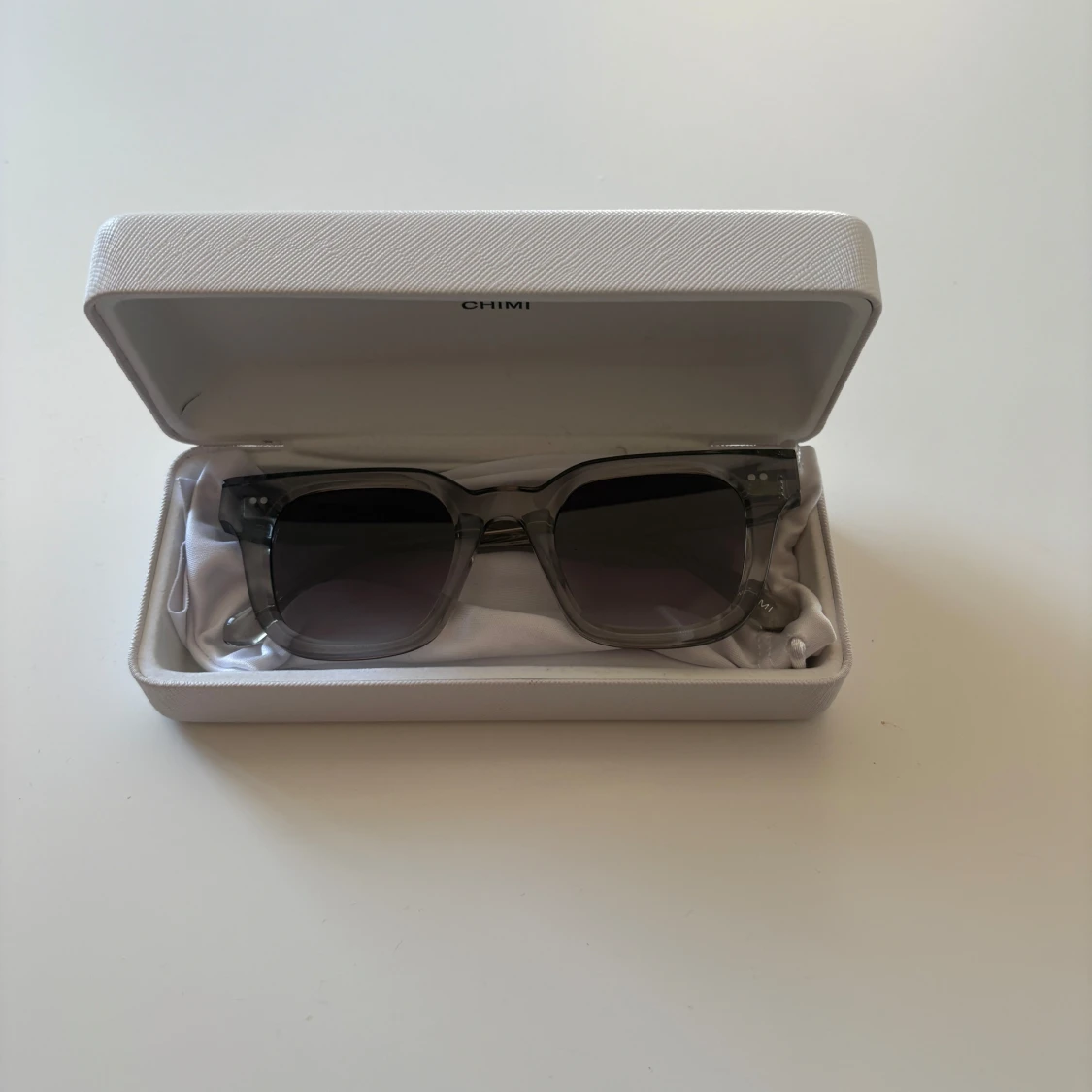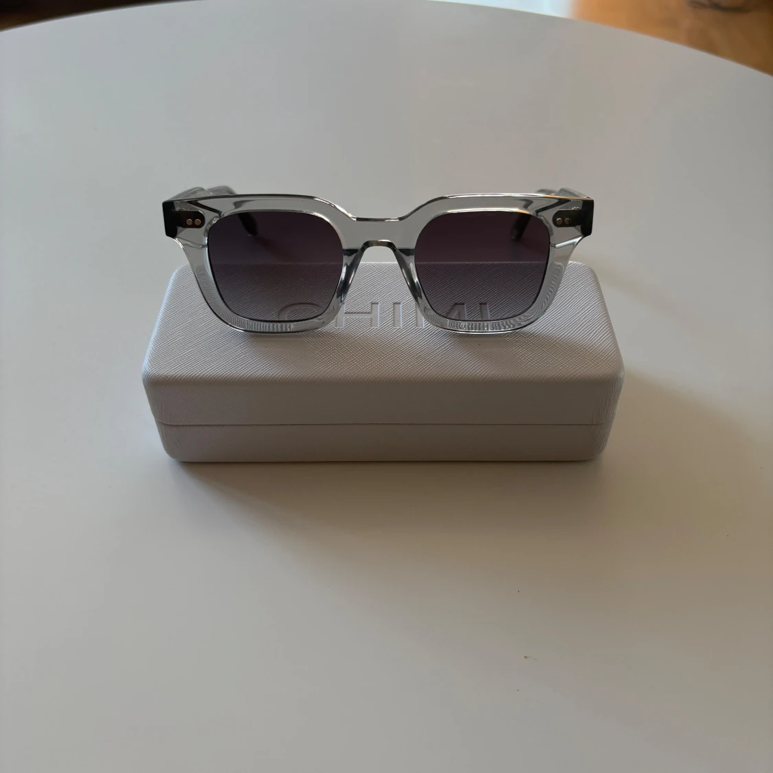 Snygga solglasögon från CHIMI med transparent grå båge och fyrkantig form. Glasen är mörktonade och ger en cool vibe. Kommer med originaletui i vitt. Perfekta för att lyfta din stil under soliga dagar.