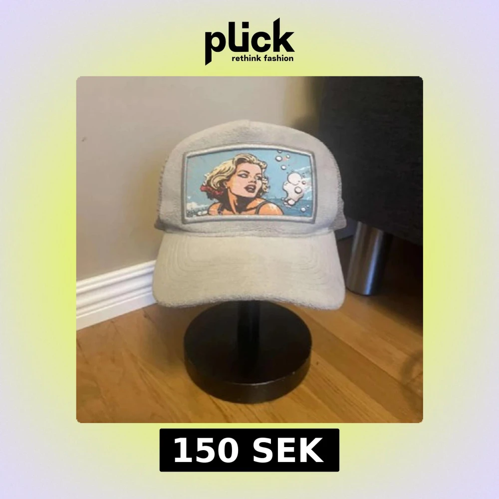 Säljer en grå truckerkeps från Revenite med mesh på sidorna och baksidan. Framtill finns en färgglad patch med pop art-motiv av en blond kvinna och bubblor mot blå bakgrund. Kepsen har böjd skärm och justerbar passform.