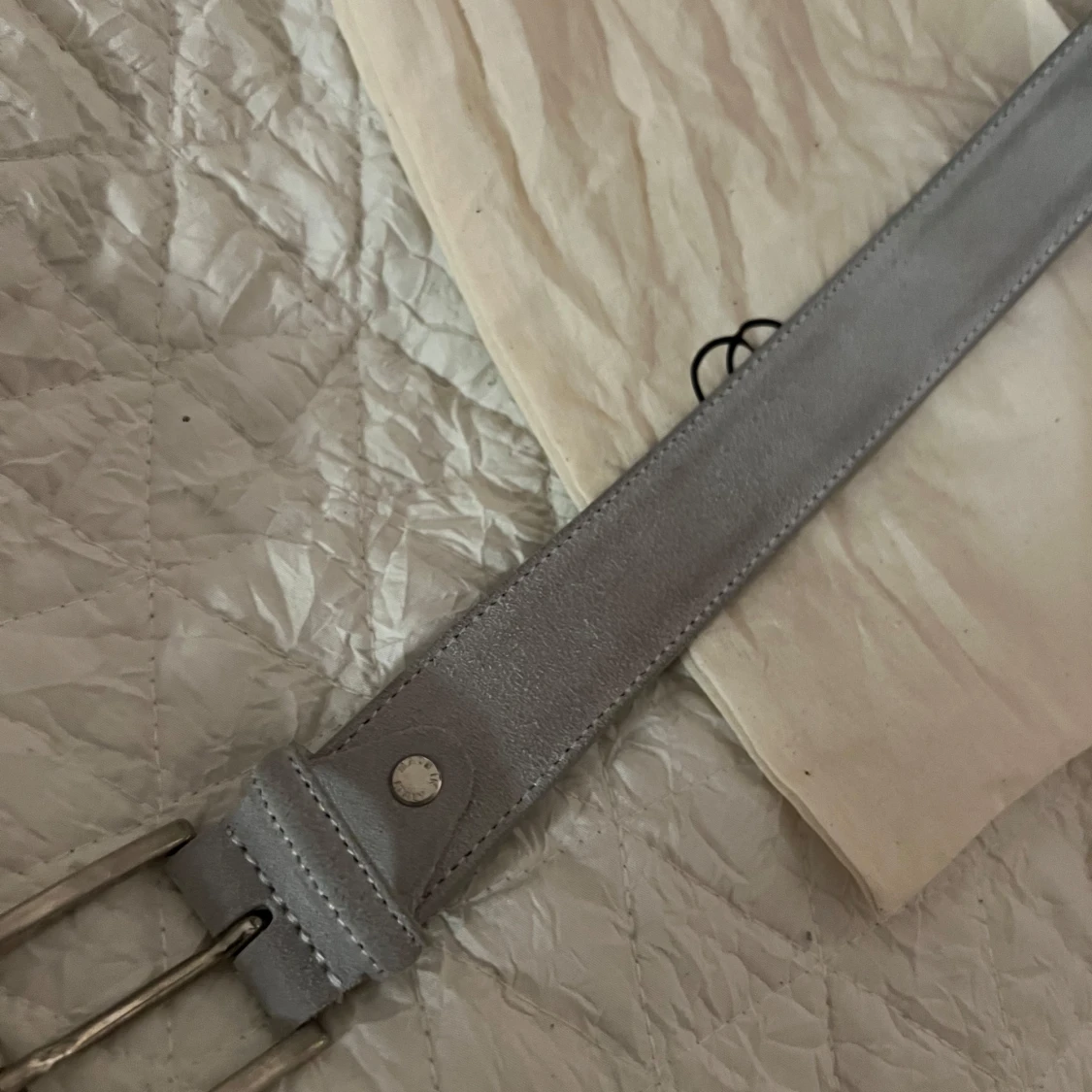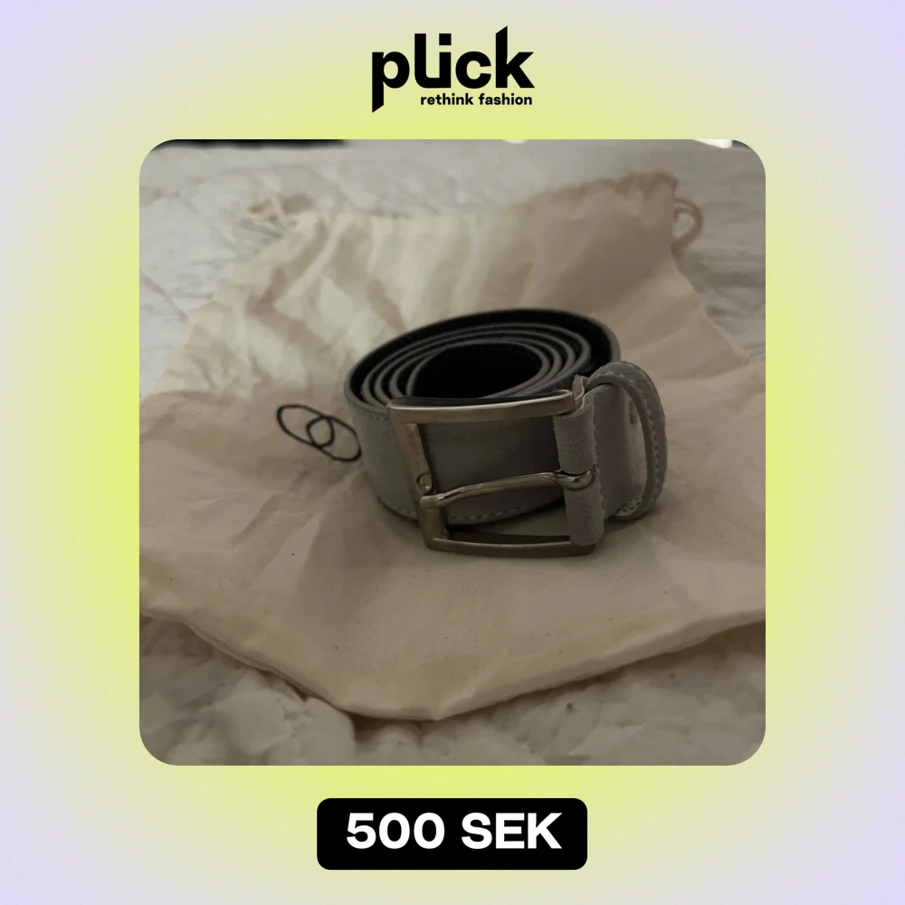 Säljer ett stilrent grått bälte från OneWear i mocka. Bältet har ett klassiskt silverfärgat spänne och är perfekt för både vardag och fest. Det är i mycket bra skick och kommer i sin originalpåse. Det är ett limited edition bälte som aldrig kommer säljas igen. Bältet är 90cm långt