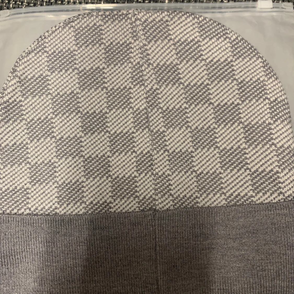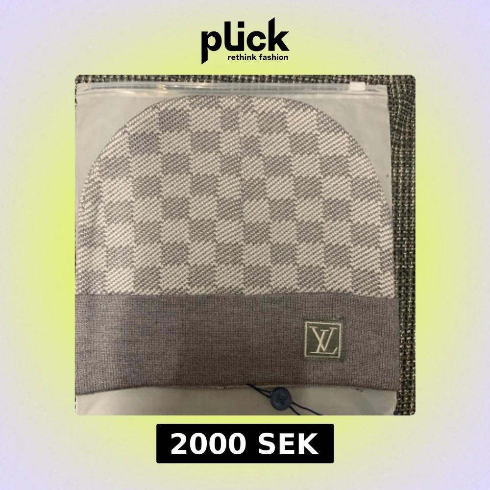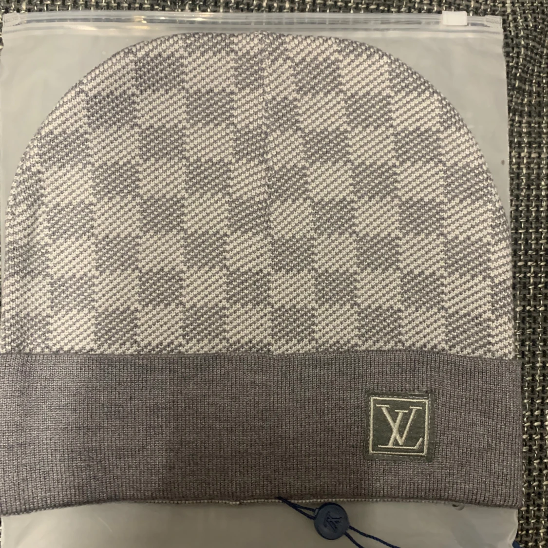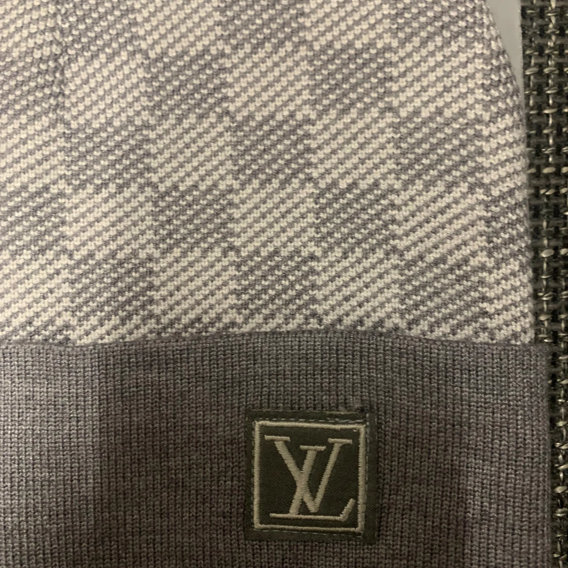 Exklusiv mössa från Louis Vuitton i grått och vitt med rutigt mönster och bred uppvikt kant. LV-logga framtill. Stickad i mjukt material som känns lyxigt och passar perfekt när du vill ha en clean och stilren look.