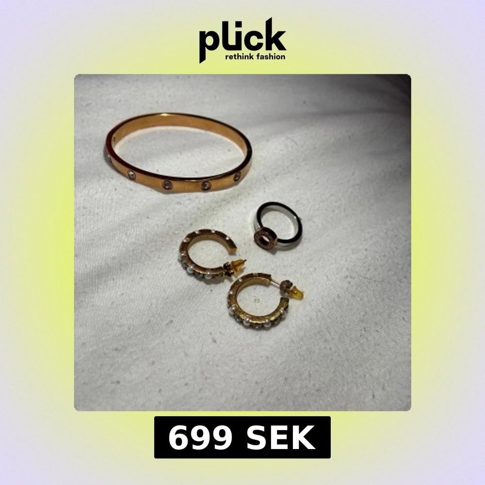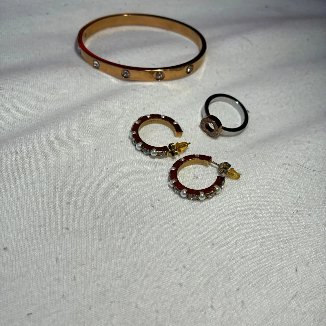 Säljer ett snyggt guldarmband med infällda stenar, ett par guldfärgade creoler med små pärlor och en svart ring med gulddetalj. Perfekt för dig som gillar att mixa olika smycken och vill ha en lyxig touch på din stil. Allt från Edblad, pris kan diskuteras vid snabb affär.