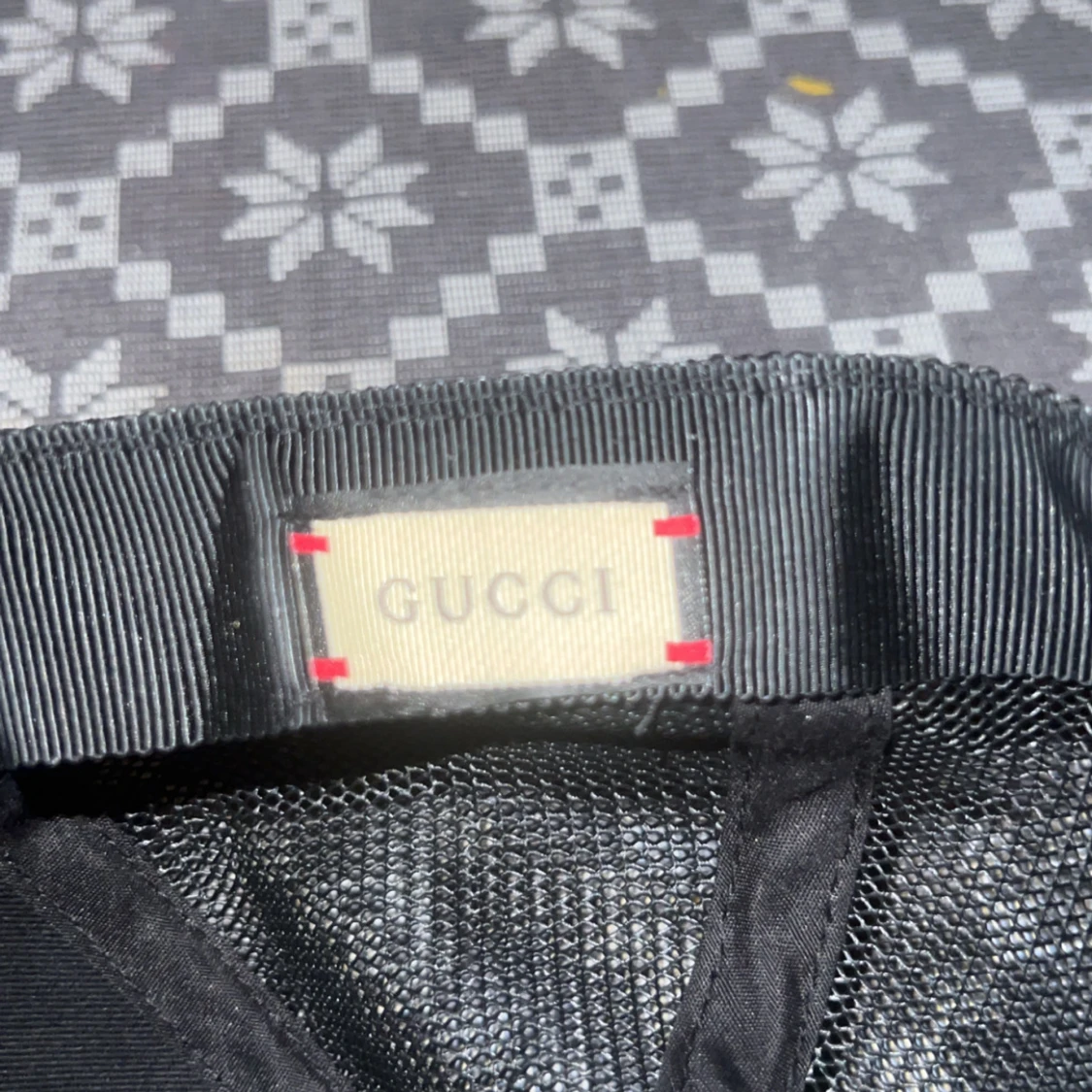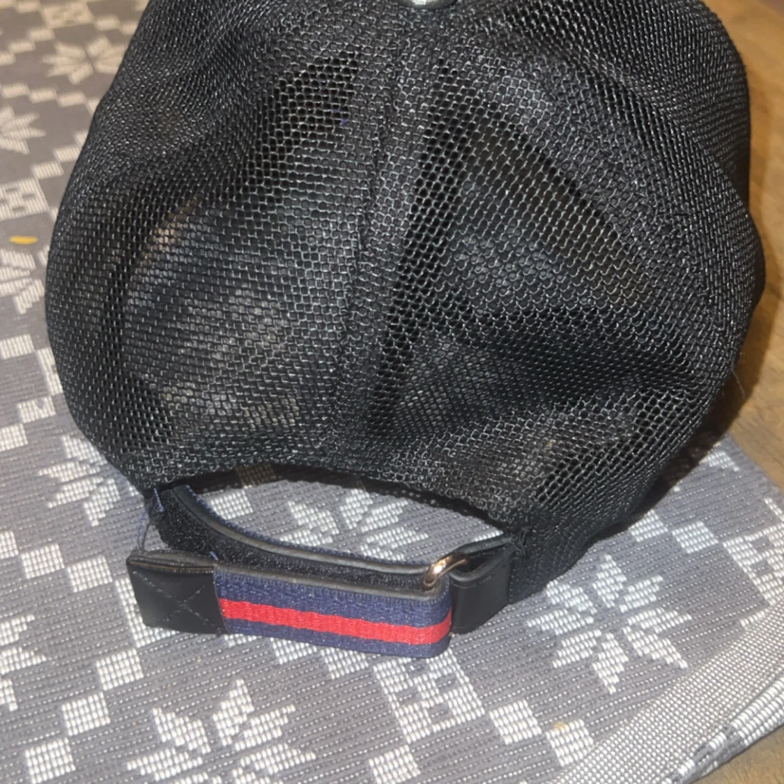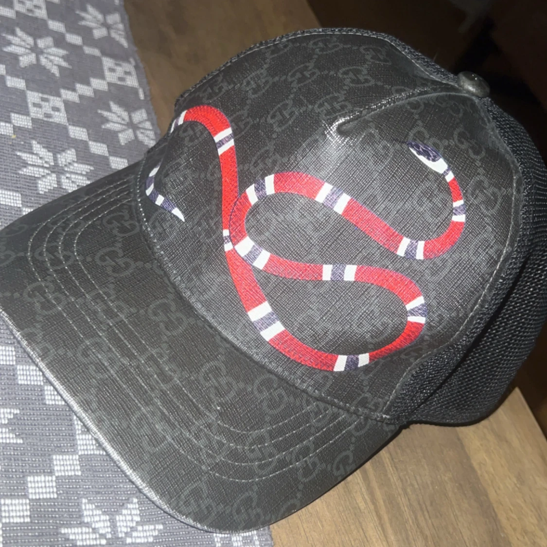 Snygg svart keps från Gucci med diskret GG-mönster och en stor röd och vit orm på framsidan. Kepsen har mesh på baksidan för extra ventilation och justerbar passform. Perfekt för dig som vill sticka ut med en exklusiv accessoar.