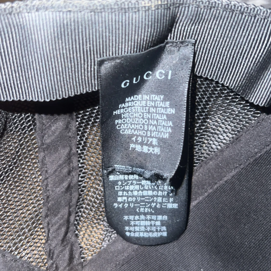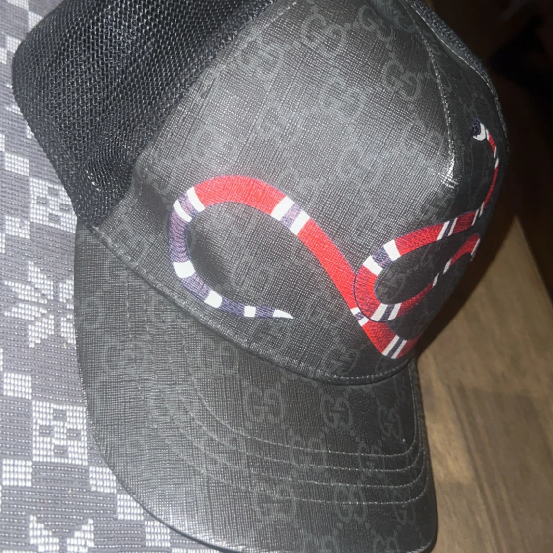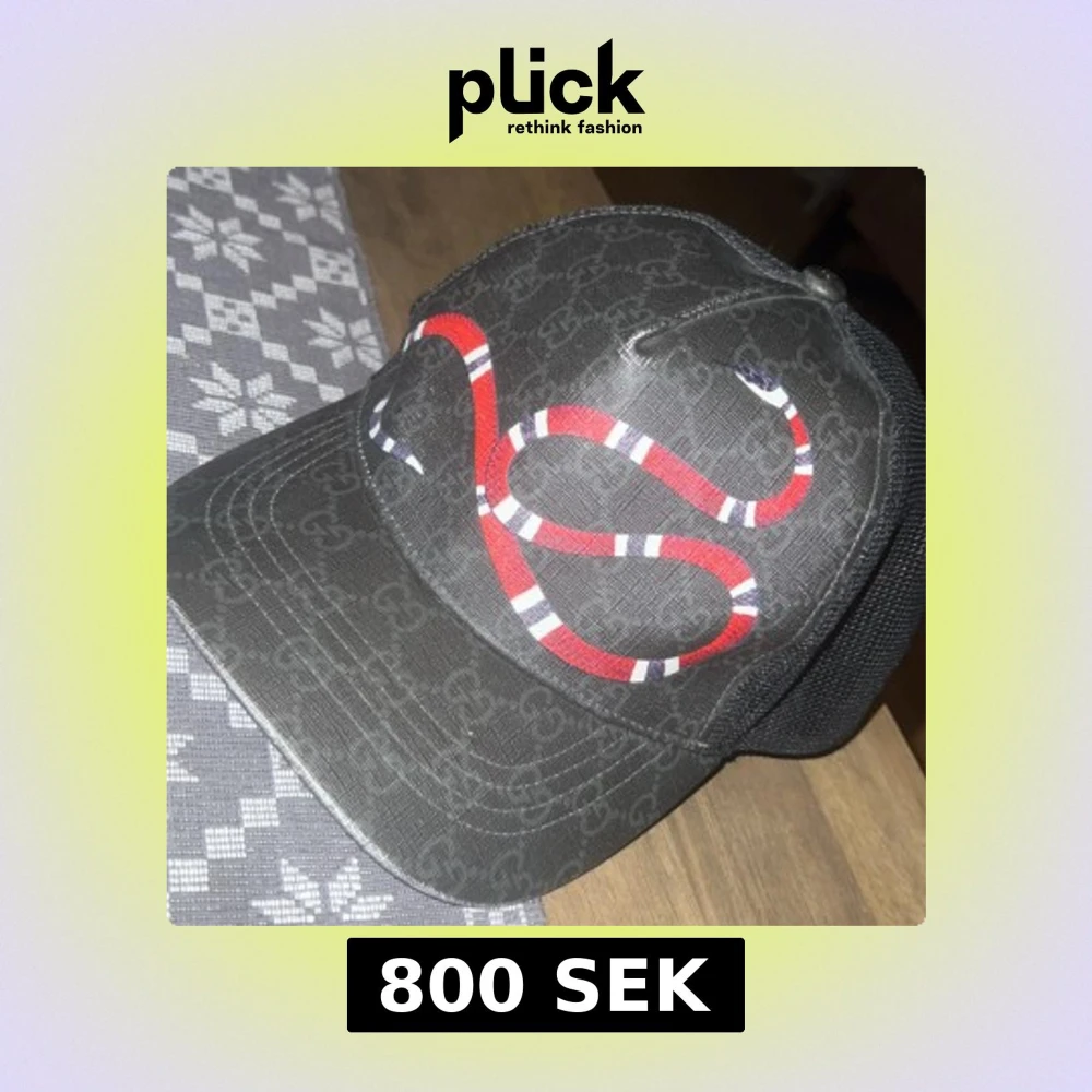 Snygg svart keps från Gucci med diskret GG-mönster och en stor röd och vit orm på framsidan. Kepsen har mesh på baksidan för extra ventilation och justerbar passform. Perfekt för dig som vill sticka ut med en exklusiv accessoar.