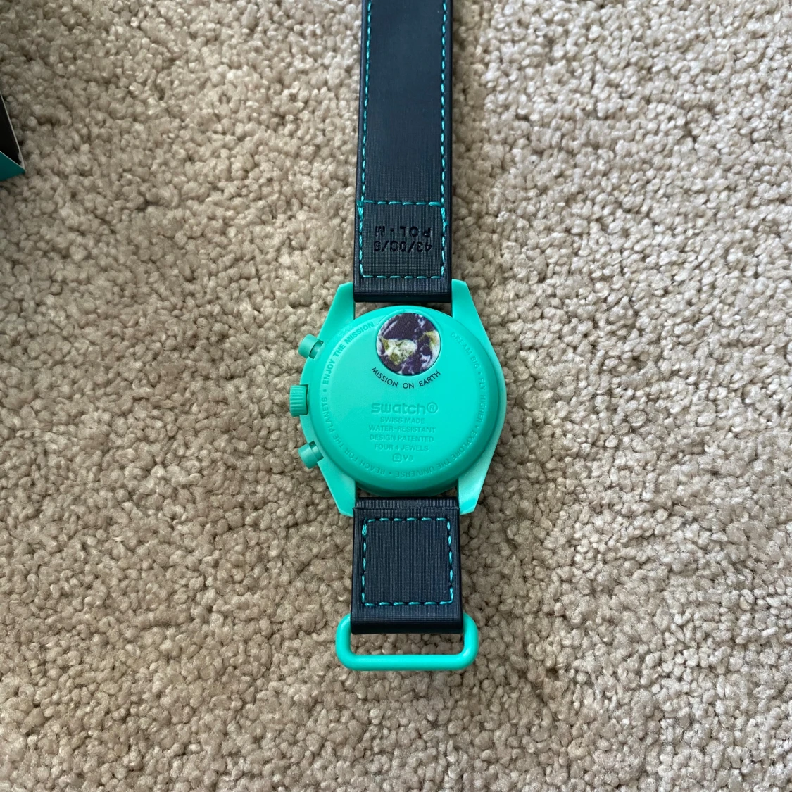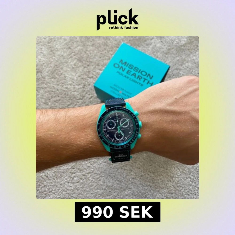 Säljer en Omega x Swatch MoonSwatch Mission on Earth Polar Lights. Klockan har en turkos boett i biokeramik, svart urtavla med kronograffunktion och blått textilband med turkosa sömmar. Snygg och unik design med tydliga detaljer och originalbox medföljer.
