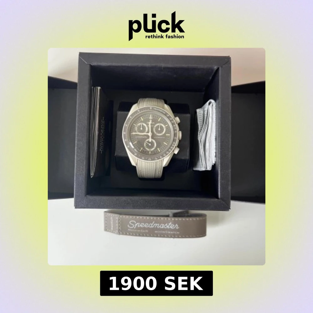 Omega x Swatch Speedmaster MoonSwatch Mission on Earth Desert med grå och silverfärgad boett och armband i biokeramik. Klockan har svart urtavla med tre subdials, tachymeter och detaljer i vitt. Baksidan pryds av en jordglob. Kommer med originalförpackning och tillbehör.