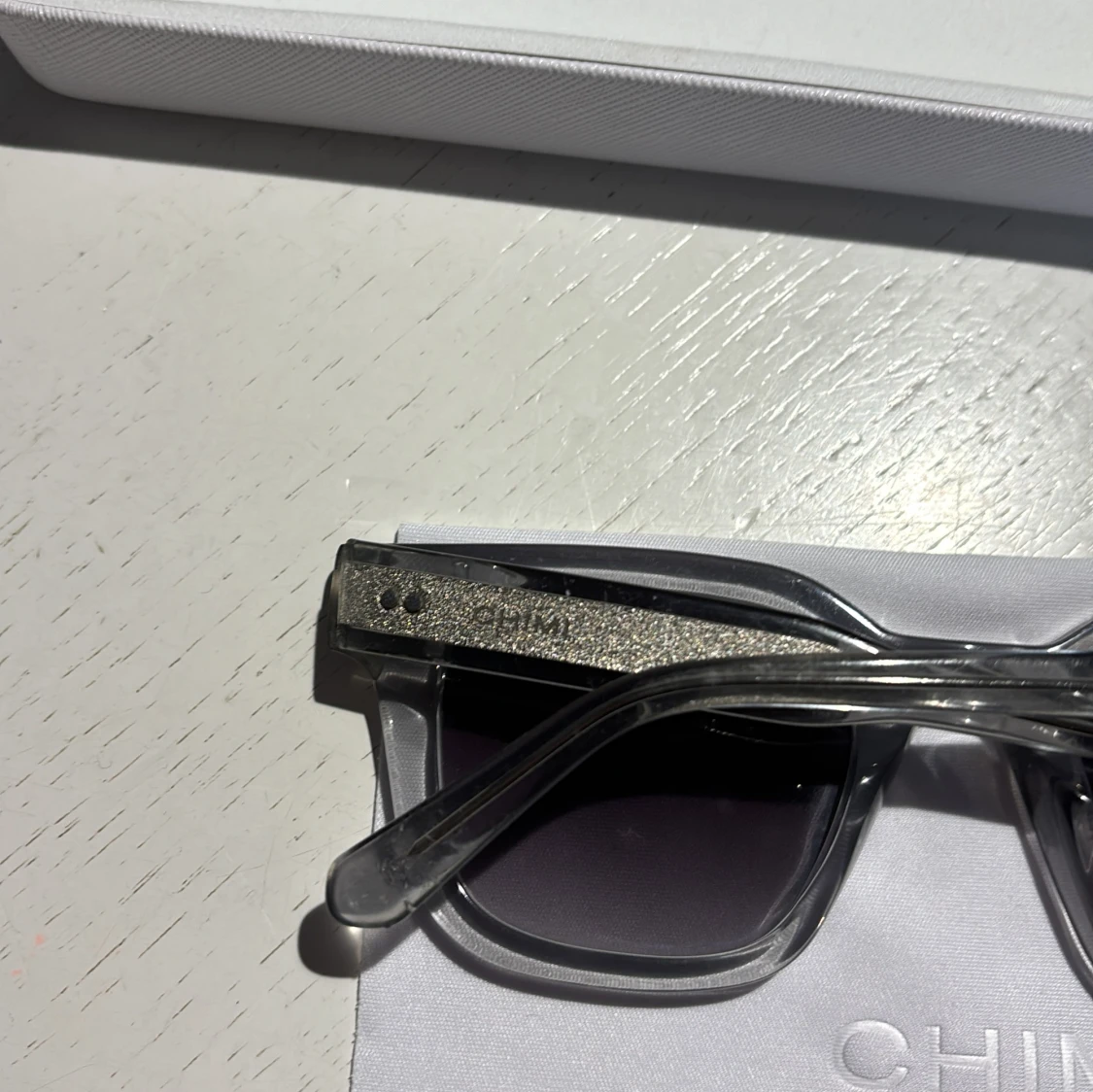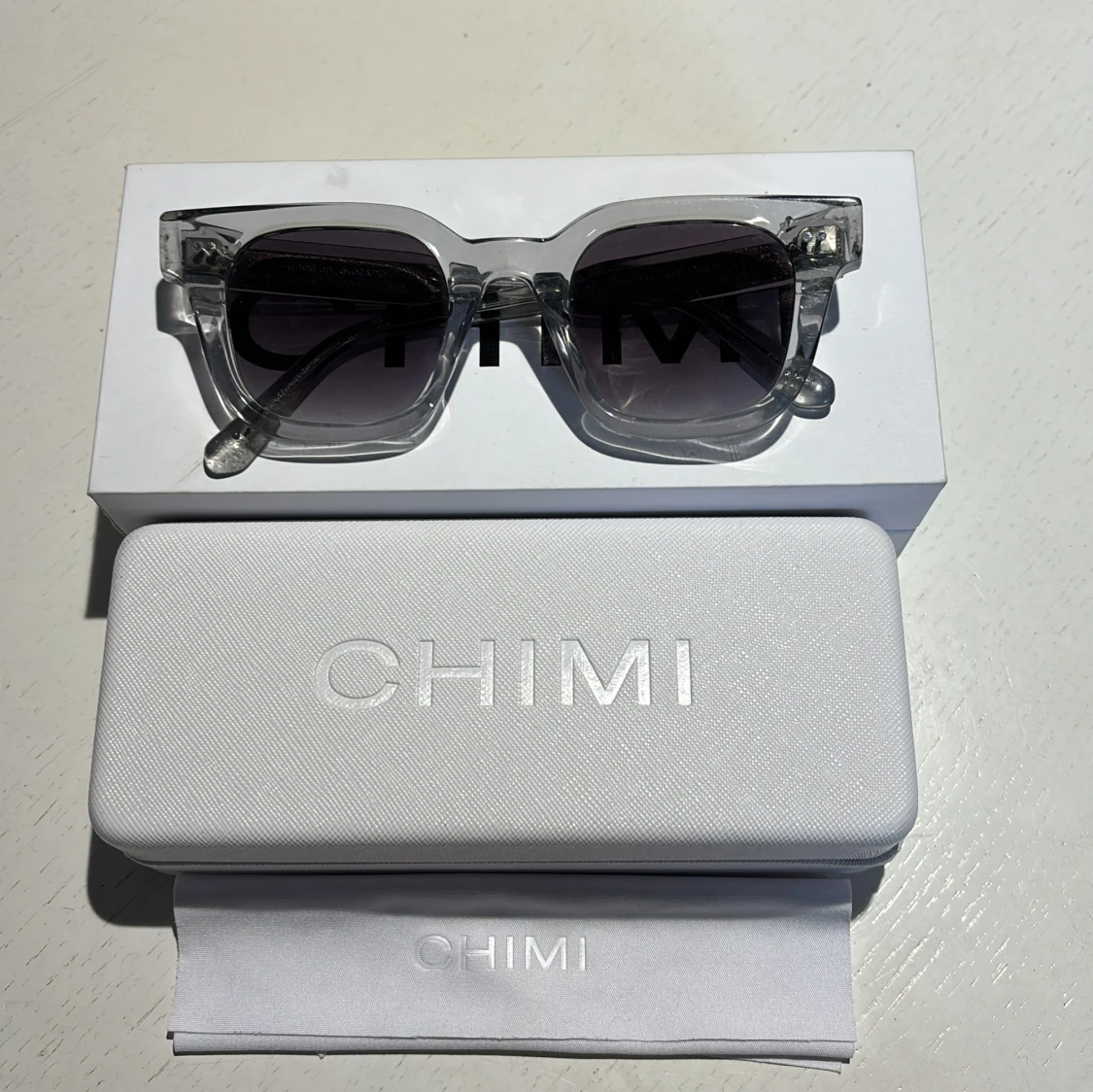 Snygga transparenta solglasögon från Chimi med glittriga detaljer på bågarna. De har en fyrkantig form och mörka linser som ger en cool look. Perfekta för att lyfta din stil till nästa nivå.