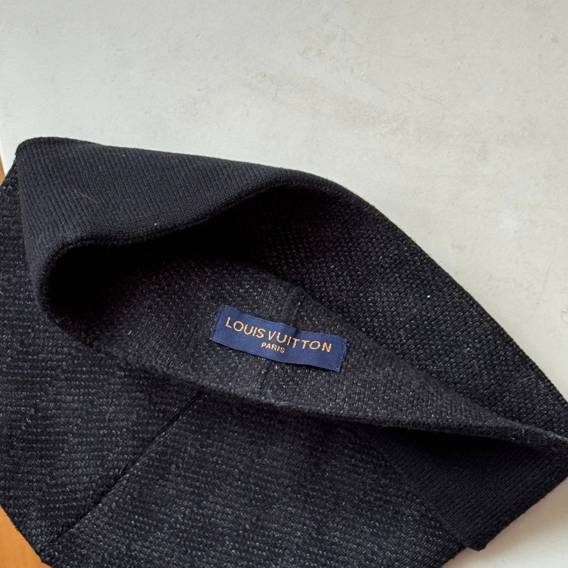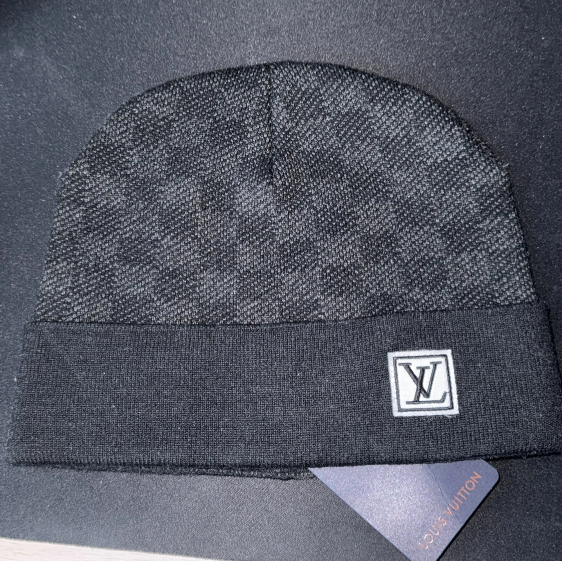 Snygg svart mössa från Louis Vuitton med diskret rutigt mönster och uppvikt kant. Märkets klassiska LV-logga i vitt och svart sitter framtill. Mössan är stickad och har en lyxig känsla, perfekt för dig som vill ha något stilrent och exklusivt. TOP PASSANDE MATERIAL‼️OBS! Tagen (sista bild sitter inte kvar men följer med)!