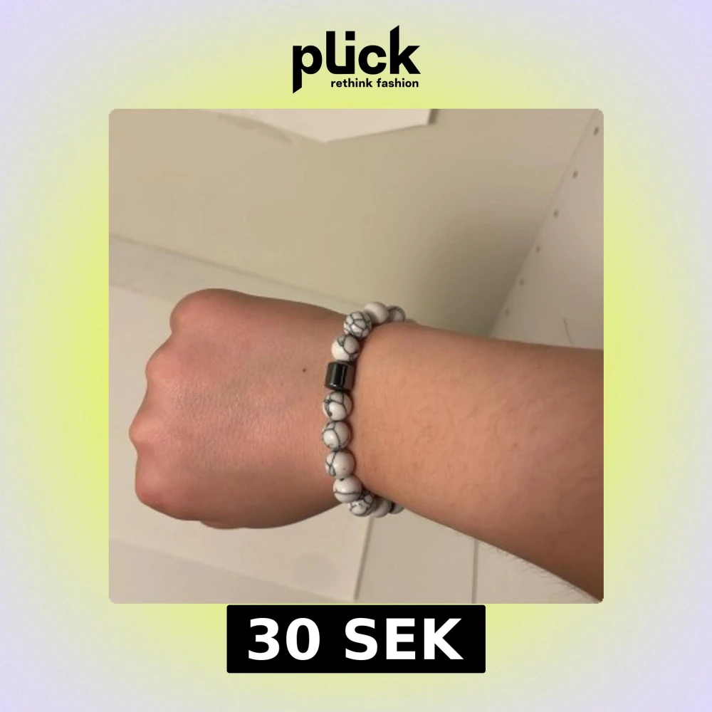 Snyggt armband med vita marmorerade pärlor och en metallisk detalj. Perfekt för att ge en stilren touch till din outfit. Elastiskt band för enkel passform.