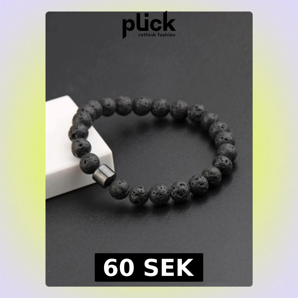 Bilderna visar ett svart armband med runda lavastenpärlor och en metallisk detalj.