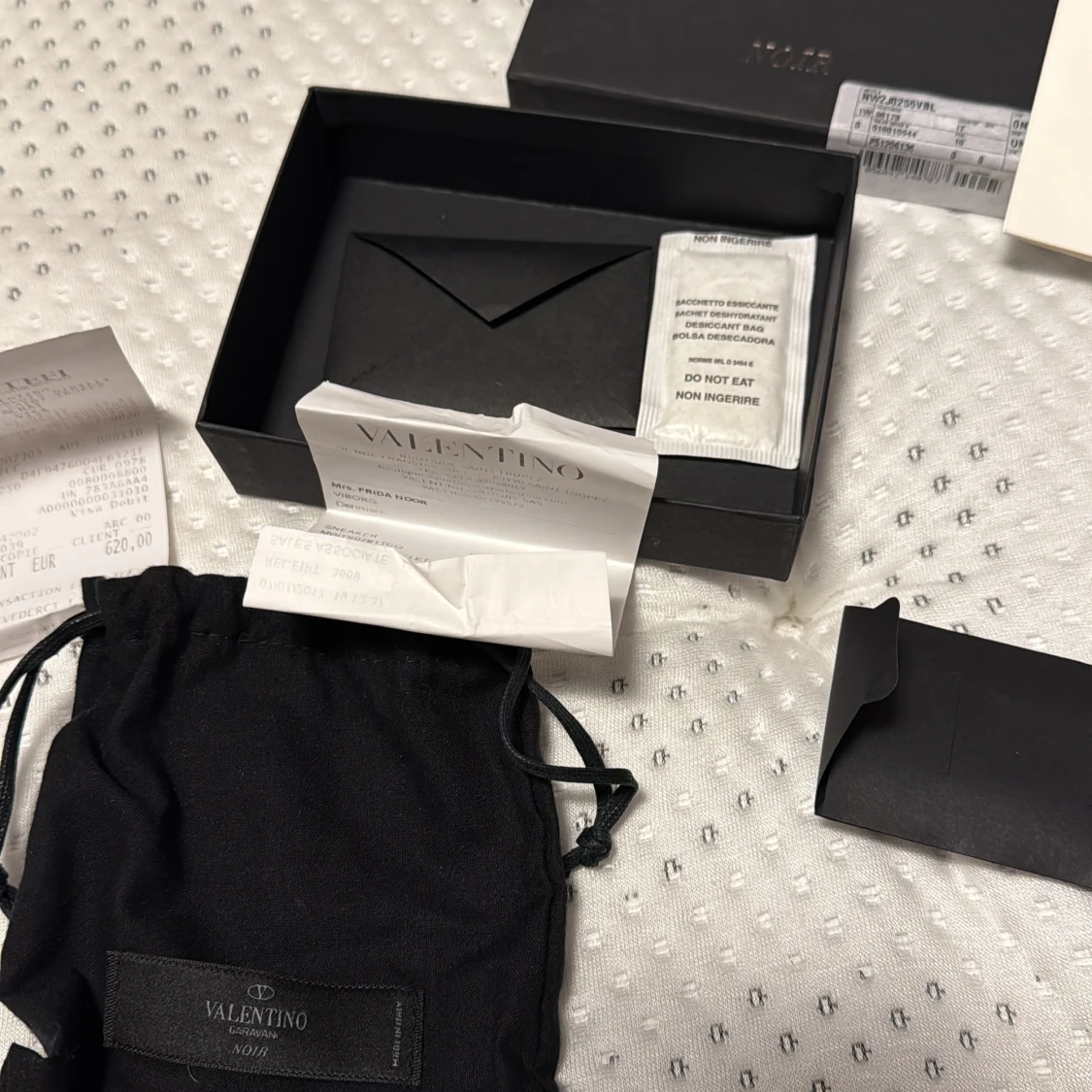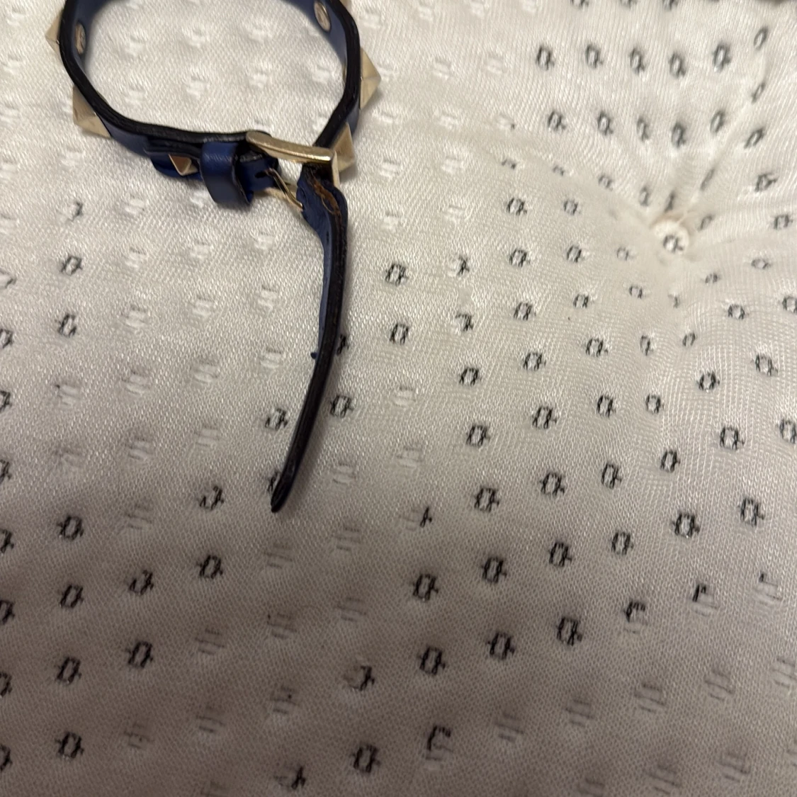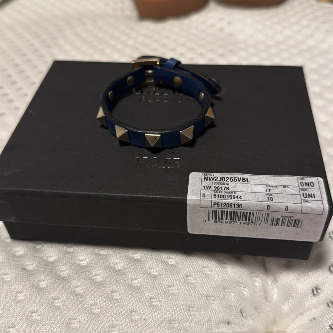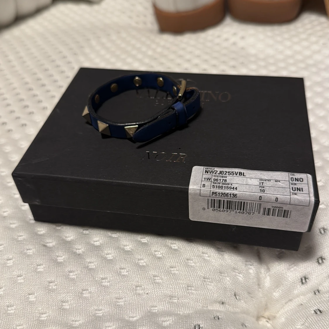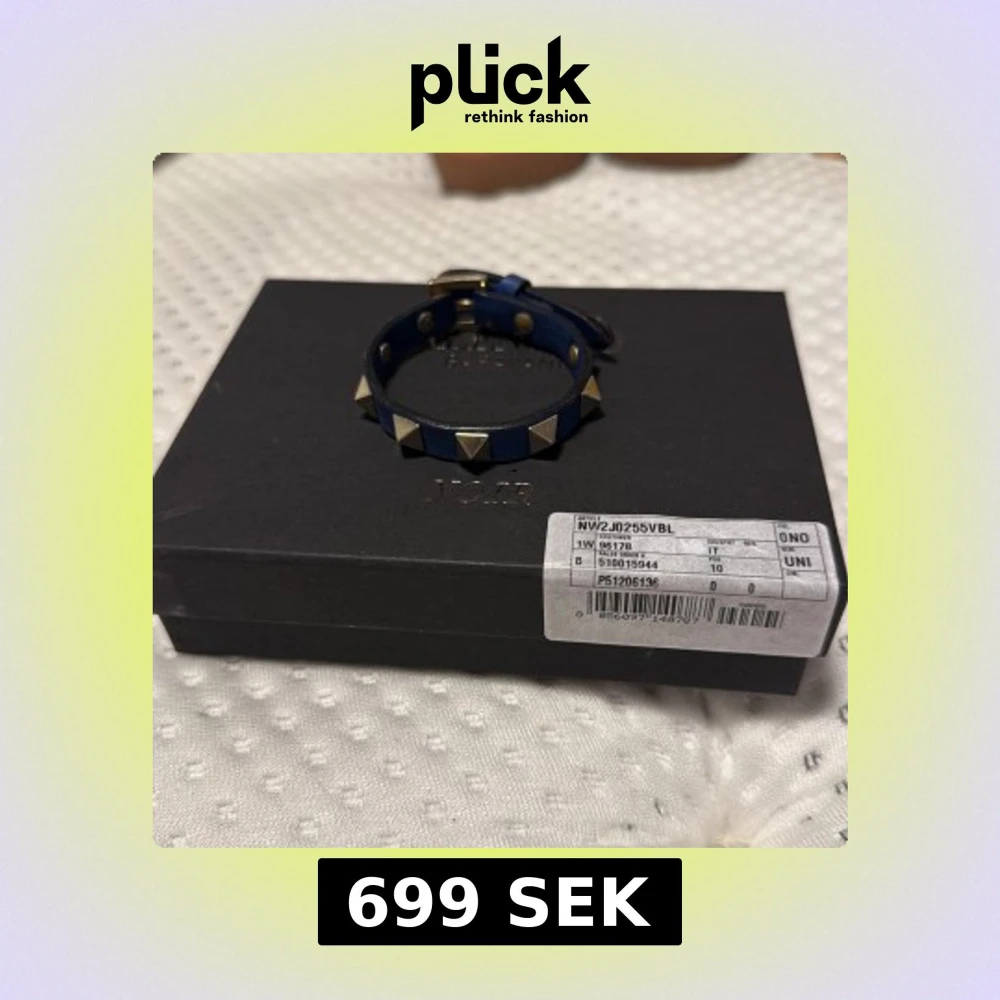 Snyggt blått armband från Valentino med coola guldfärgade pyramidnitar och justerbart spänne. Armbandet är gjort i skinn och kommer med originalask, dustbag och äkthetsbevis. Perfekt accessoar för att lyfta din outfit. Helt ok allt som de kom med finns kvar