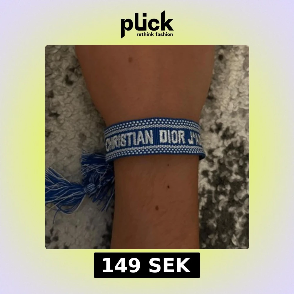 Snyggt blått armband från Christian Dior med vit broderad text och dekorativa fransar i ändarna. Armbandet har en cool och trendig look som passar perfekt till din outfit. Justerbar storlek med knytning.