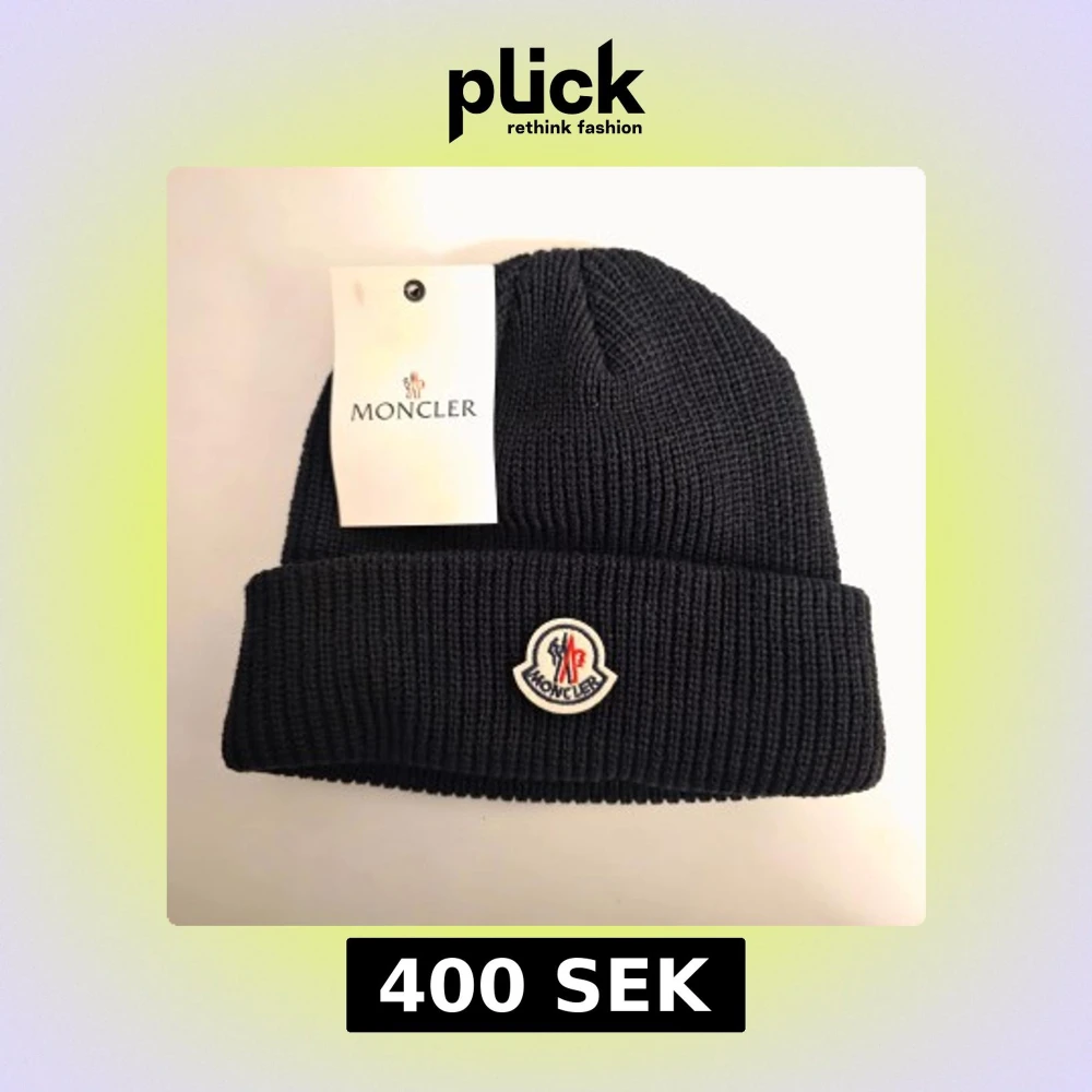 Säljer 1 för 300kr, 2 för 500kr, 3 för 700kr. Snygg svart ribbad mössa från Moncler med broderad logotyp framtill. Perfekt för att hålla värmen under kyliga dagar. PRIS KAN DISKUTERAS!!!