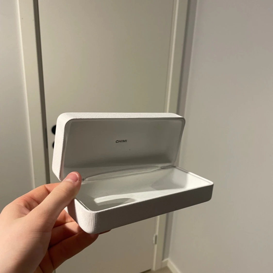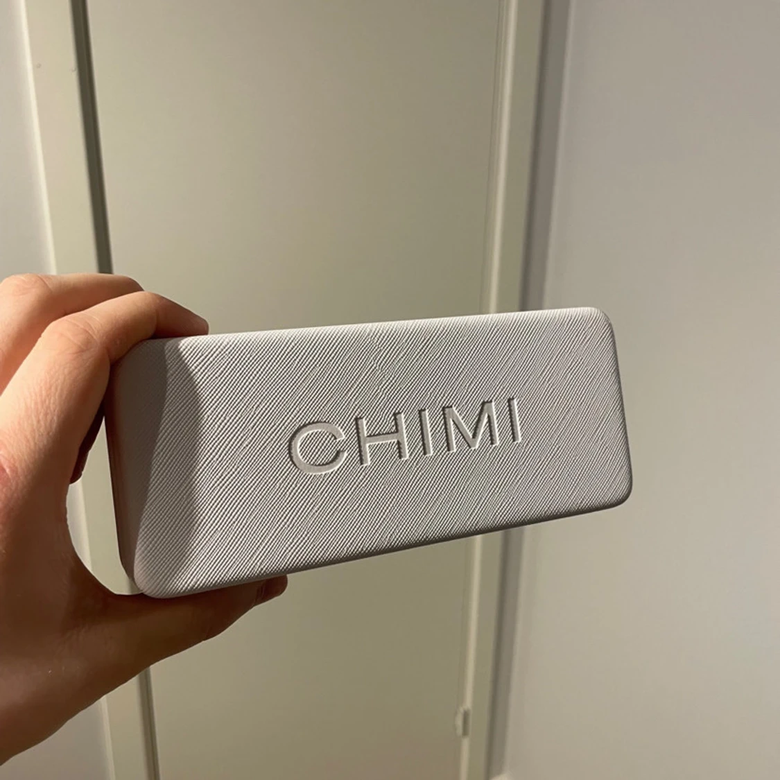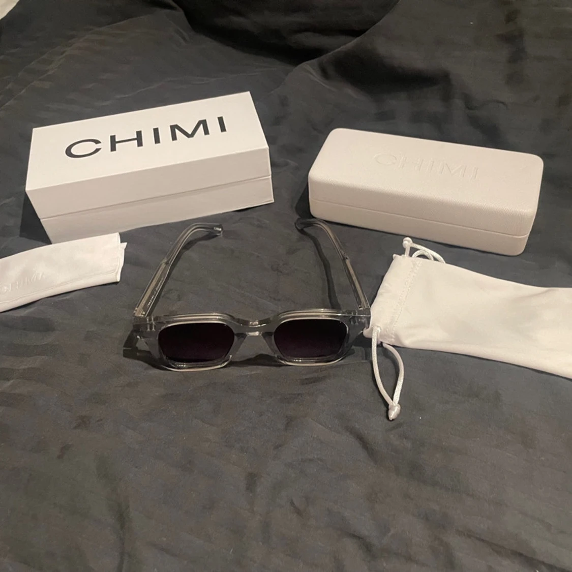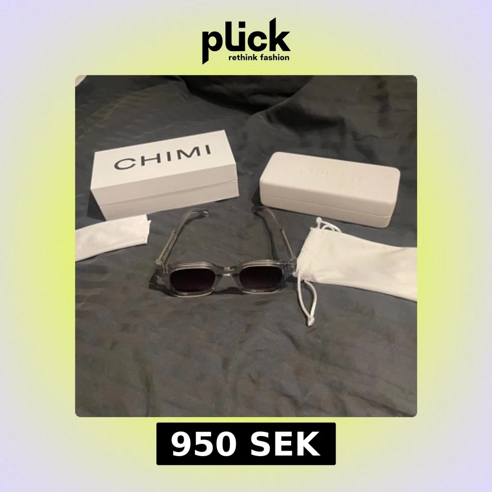 Snygga grå solglasögon från CHIMI med transparent båge och mörka linser. Perfekta för en stilren look. Kommer med originalförpackning och fodral. Bara provade allt finns med.