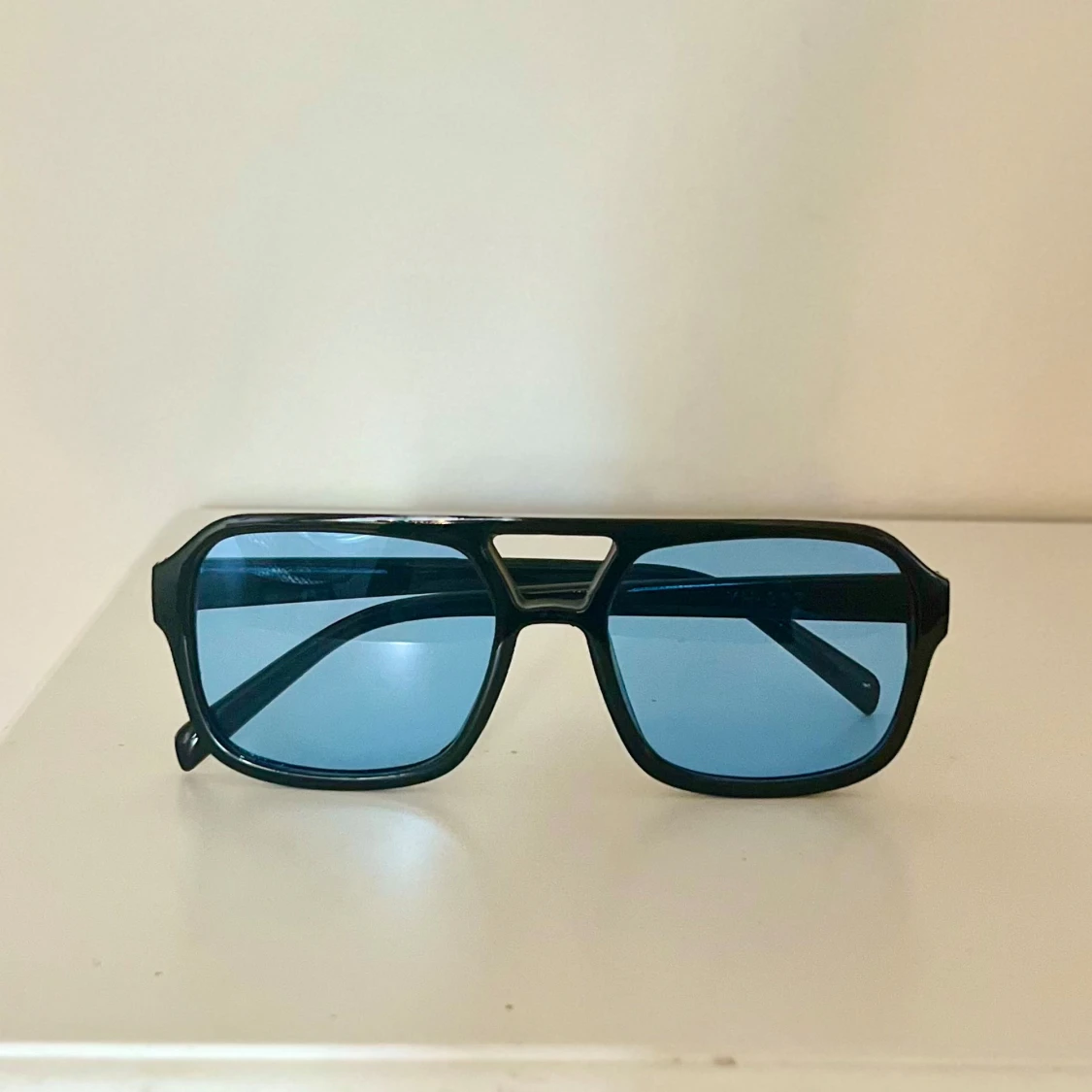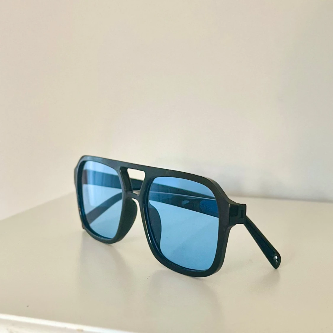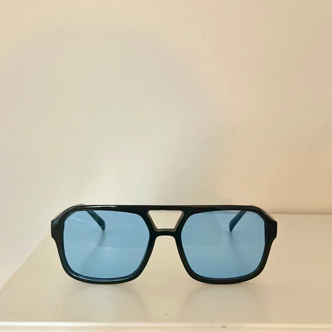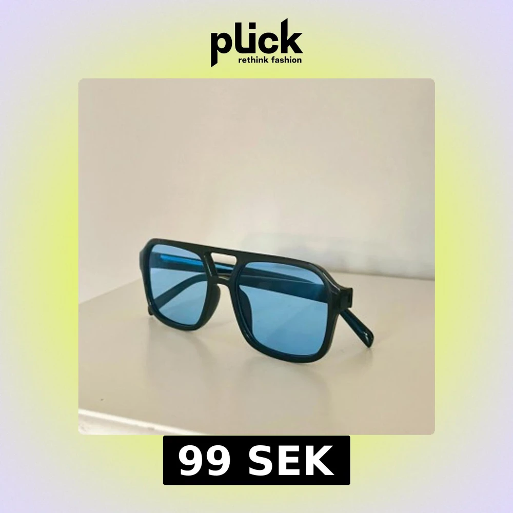 Snygga solglasögon med svart båge och rektangulär form. Glasen är blåtonade och ger en cool retrovibe🤵🏼Perfekta för att sticka ut i sommar☀️Bågarna är i plast och modellen är oversized😎