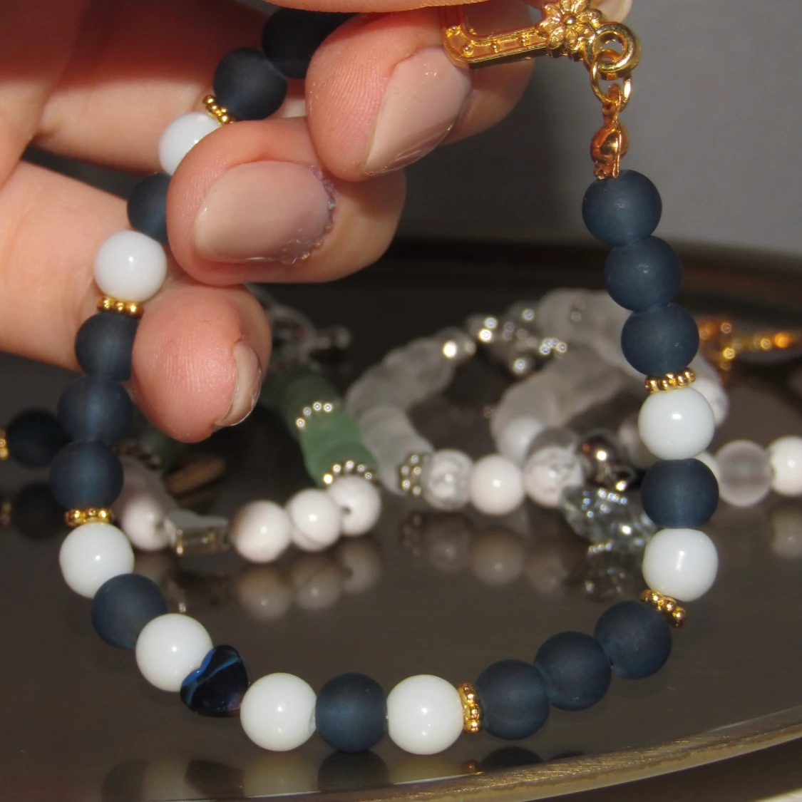 Handgjort armband av högkvalitét material, guldfärgade detaljer och lås och en hjärta av hematit i mitten. Hematit sägs ge en lugnande effekt. Frakt ingår.