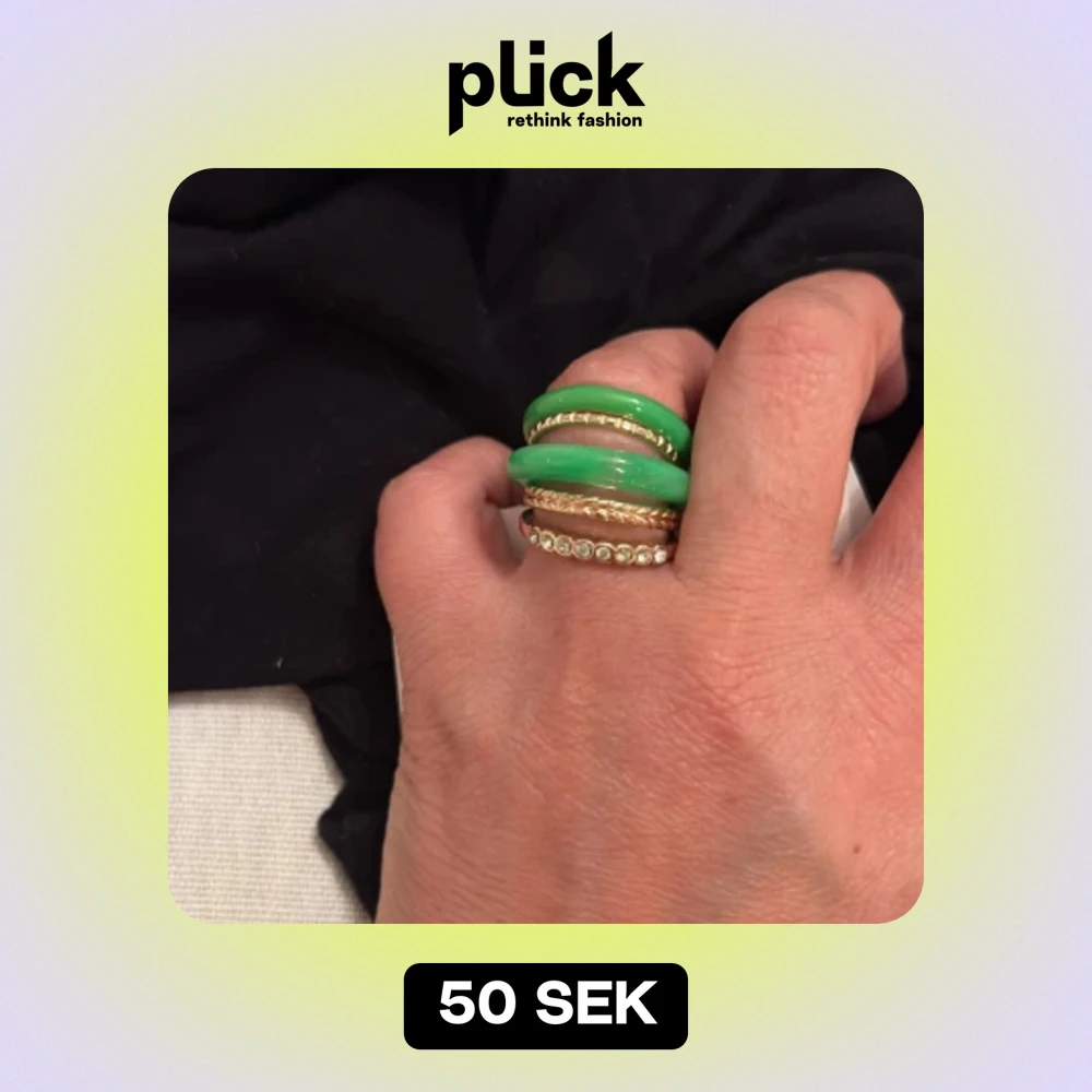 Säljer ett set med flera ringar i olika stilar och färger. En av ringarna är i en härlig grön färg, medan de andra har en elegant guldton. En av guldringarna är dekorerad med glittrande stenar som ger en extra touch av glamour. Perfekt för att mixa och matcha till olika outfits!