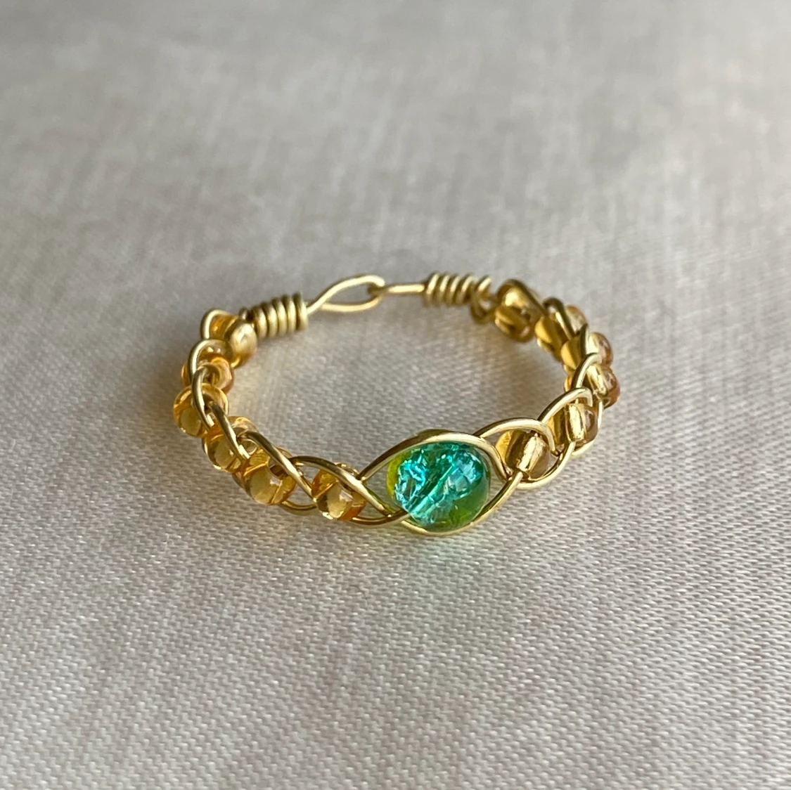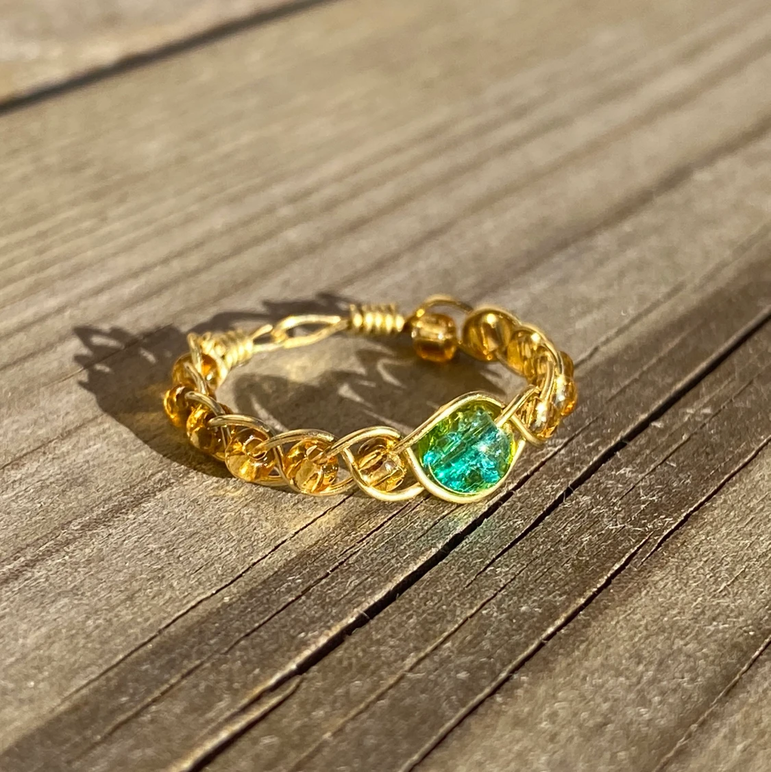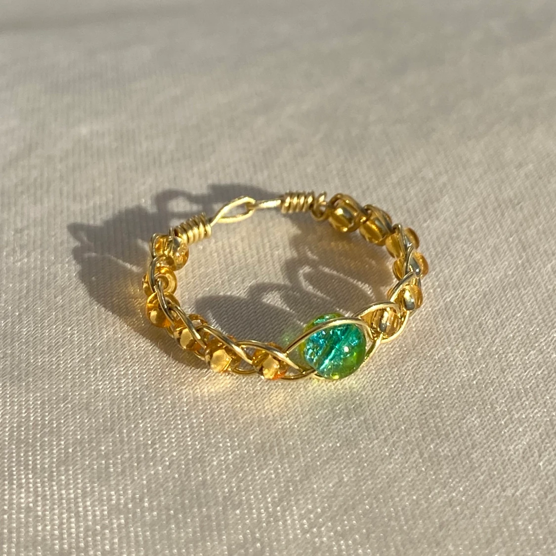 En superfin handgjord ring ”draköga” 🐉 med krackelerad glaspärla 😍. Färgskiftningar i grön/turkos/guld/gul