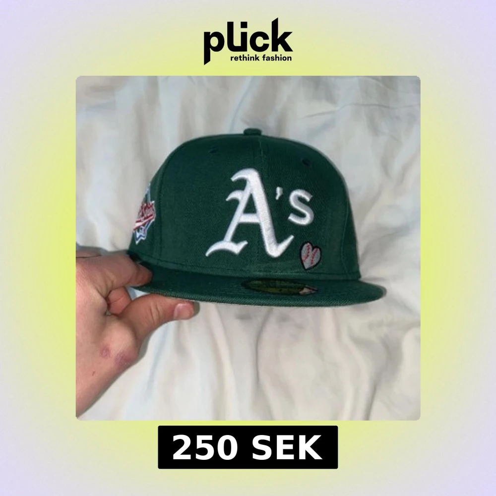 Snygg grön keps från New Era med broderad logga och text. Kepsen har en platt skärm och är dekorerad med ett hjärta och texten 'Love & Hustle = Game'. Perfekt för att ge din outfit en sportig touch.