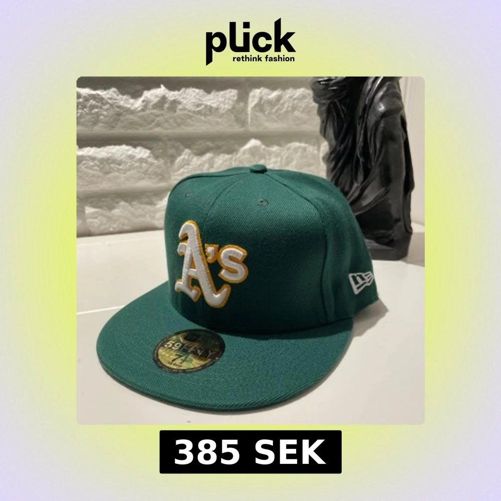 Säljer en grön New Era 59FIFTY keps med Oakland Athletics A's broderat i vitt och gult framtill. Klassisk basebollmodell med platt skärm och MLB-logga bak. Kepsen är i bomull och har officiell MLB-hologram på insidan. Oanvänd