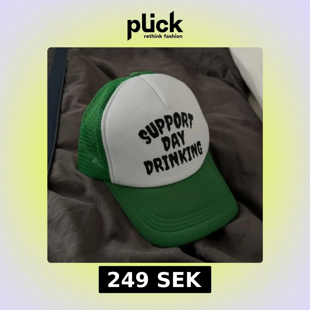 Snygg truckerkeps i grönt och vitt med texten 'SUPPORT DAY DRINKING' framtill. Kepsen har mesh på sidorna och bak för extra ventilation och en böjd skärm. Perfekt accessoar för en chill och avslappnad stil.