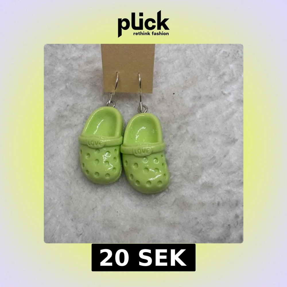 Unika örhängen formade som små gröna crocs med texten 'LOVE' på framsidan. De har en blank finish och är riktigt roliga att bära för dig som gillar annorlunda smycken. Perfekt för att sticka ut och visa din personlighet.