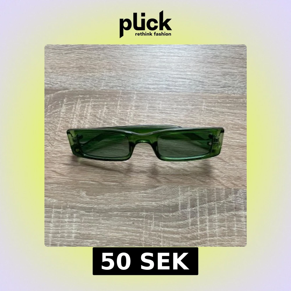 Snygga gröna solglasögon med rektangulär form och transparent båge. Glasen är tonade i grönt och bågarna likaså. Perfekt accessoar för dig som vill ha en unik look och gillar trendiga detaljer. Vet ej märket. Använt fåtal gånger.