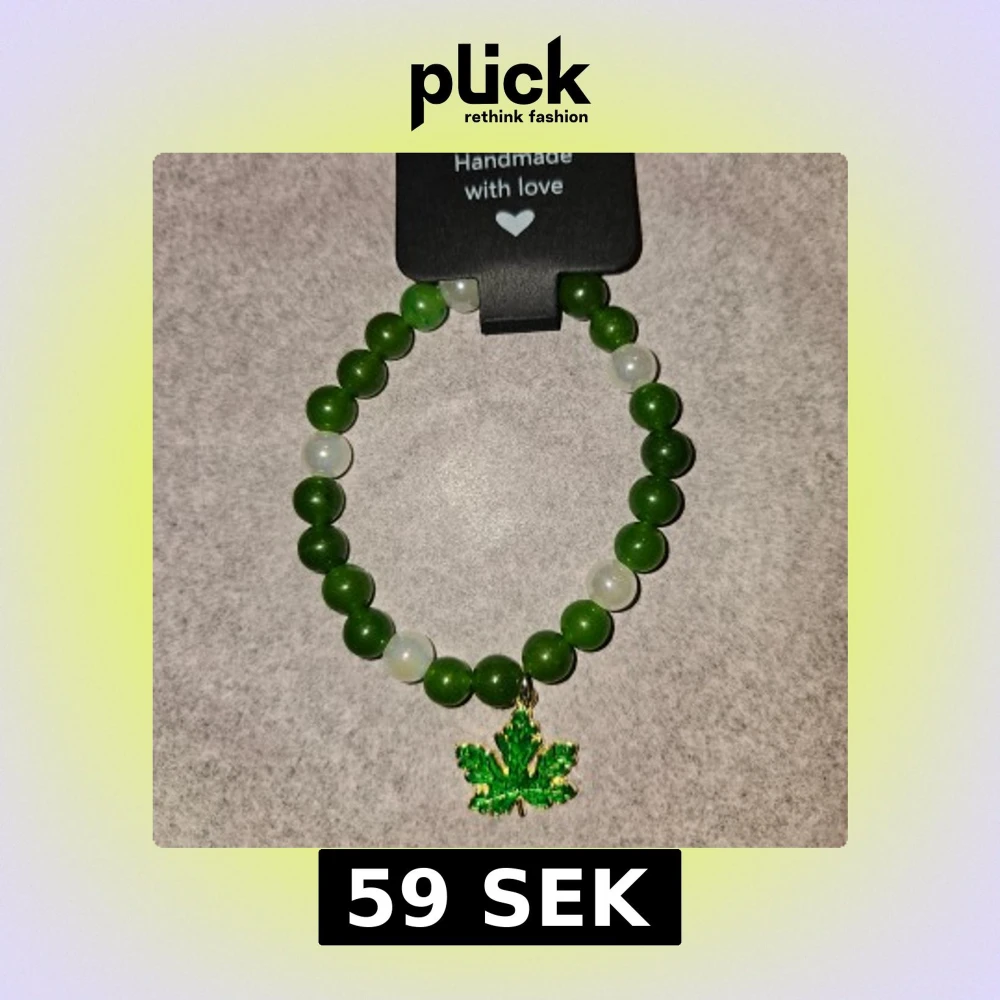 Unikt armband med gröna och vita pärlor, dekorerat med en grön lönnlöv berlock. Stretchig design som passar de flesta handleder. Perfekt för dig som gillar naturinspirerade detaljer och vill sticka ut med ett coolt smycke. Ca 17cm