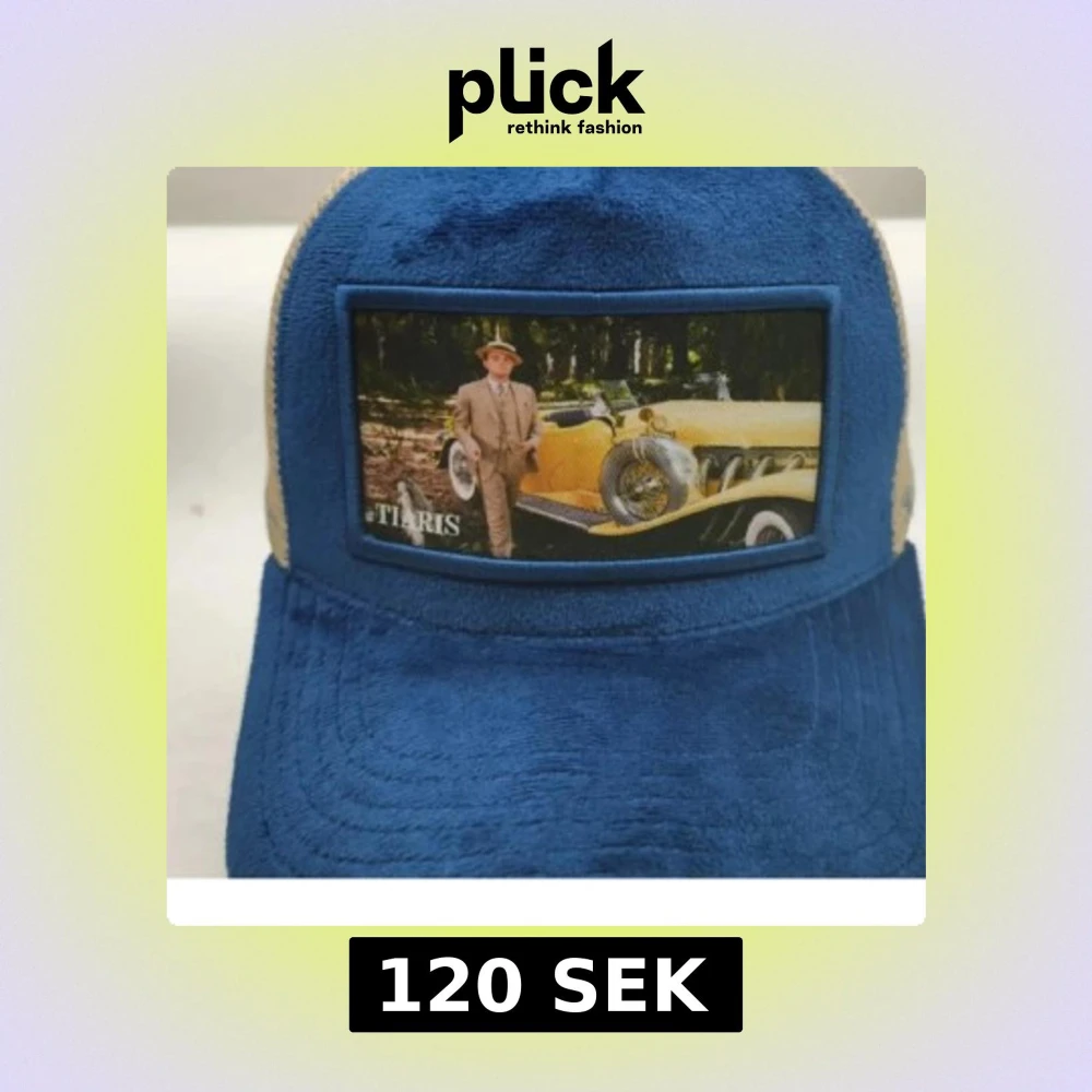 Snygg blå keps med beige mesh på sidorna och baksidan. Framtill finns ett färgglatt bildmotiv med en man och en gul veteranbil. Justerbar rem baktill för perfekt passform. Är prutbar vid snabbaffär skriv om du har några frågor eller funderingar