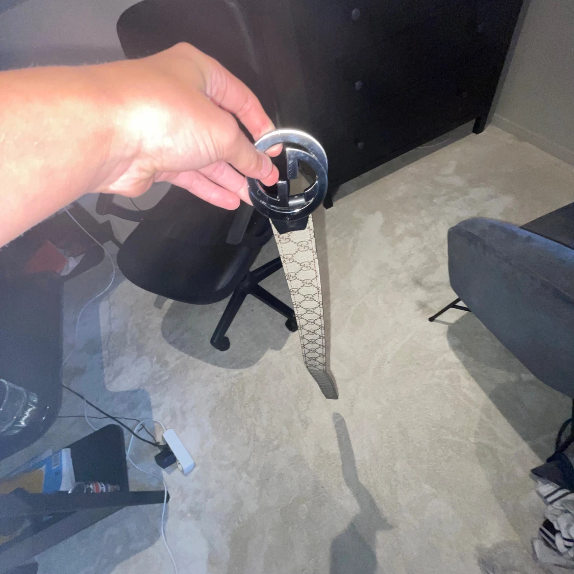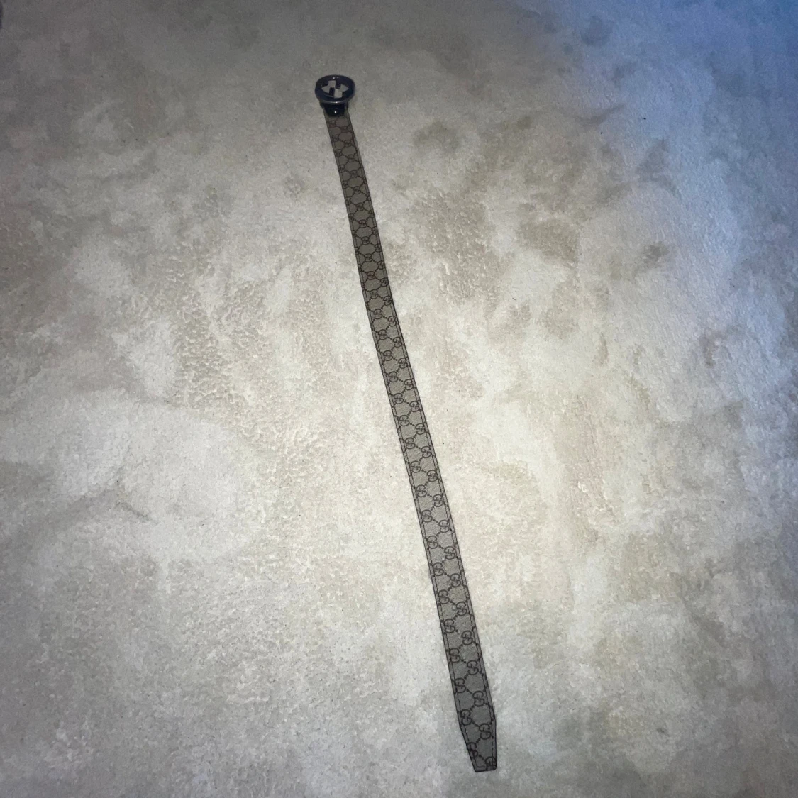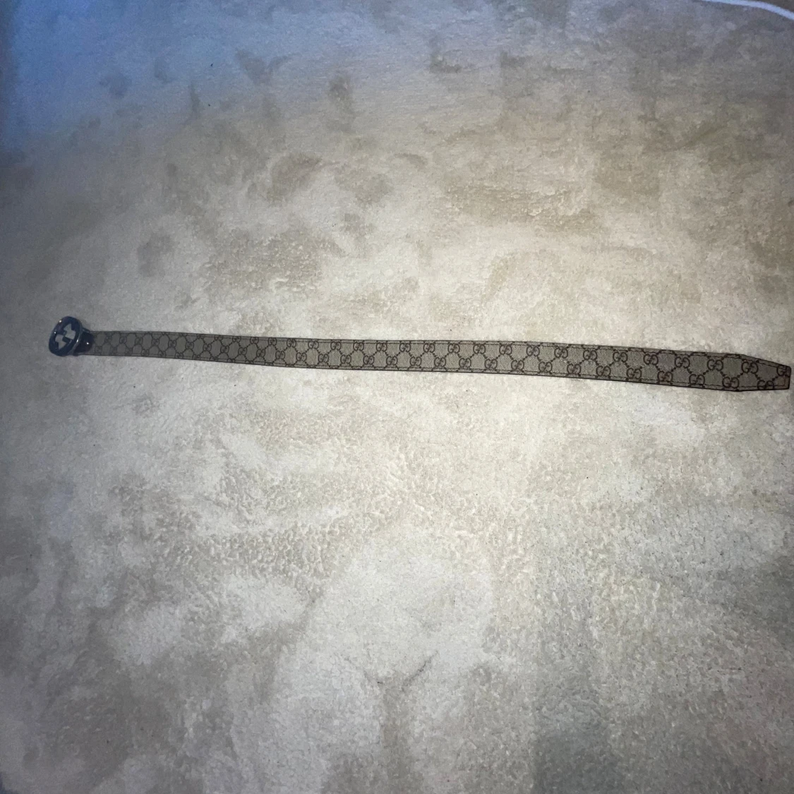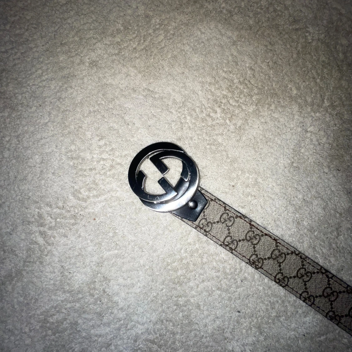 Snyggt Gucci-bälte i klassiskt GG Supreme-mönster med beige och bruna toner. Bältet har en rund, silverfärgad spänne med GG-logga och är gjort i skinn med canvas-yttersida. Perfekt för att lyfta vilken outfit som helst med en lyxig touch.