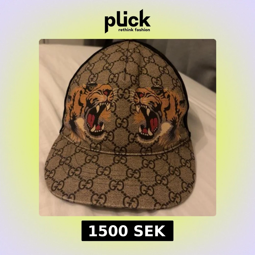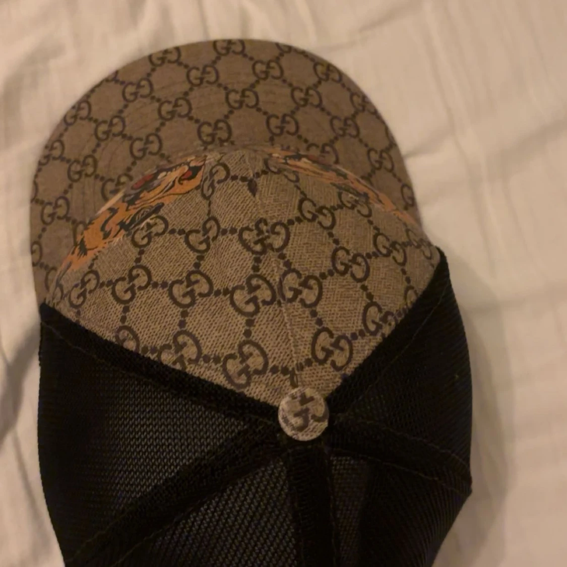 Säljer en snygg keps från Gucci med klassiskt GG-mönster i beige och brunt. Framsidan har två stora, detaljerade tigerhuvuden och kepsen har svart mesh på baksidan. Märkeslogga syns tydligt och materialet är en mix av canvas och mesh. Kepsen är i storlek M men är lite uttöjd så passar också folk i storlek L, ifall du inte har den storleken så kan du alltid justera den med karbobanden där bak.