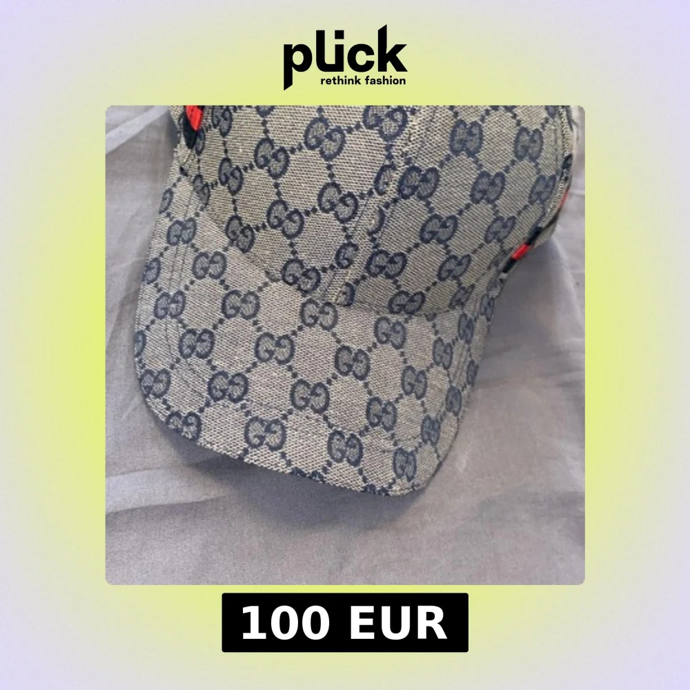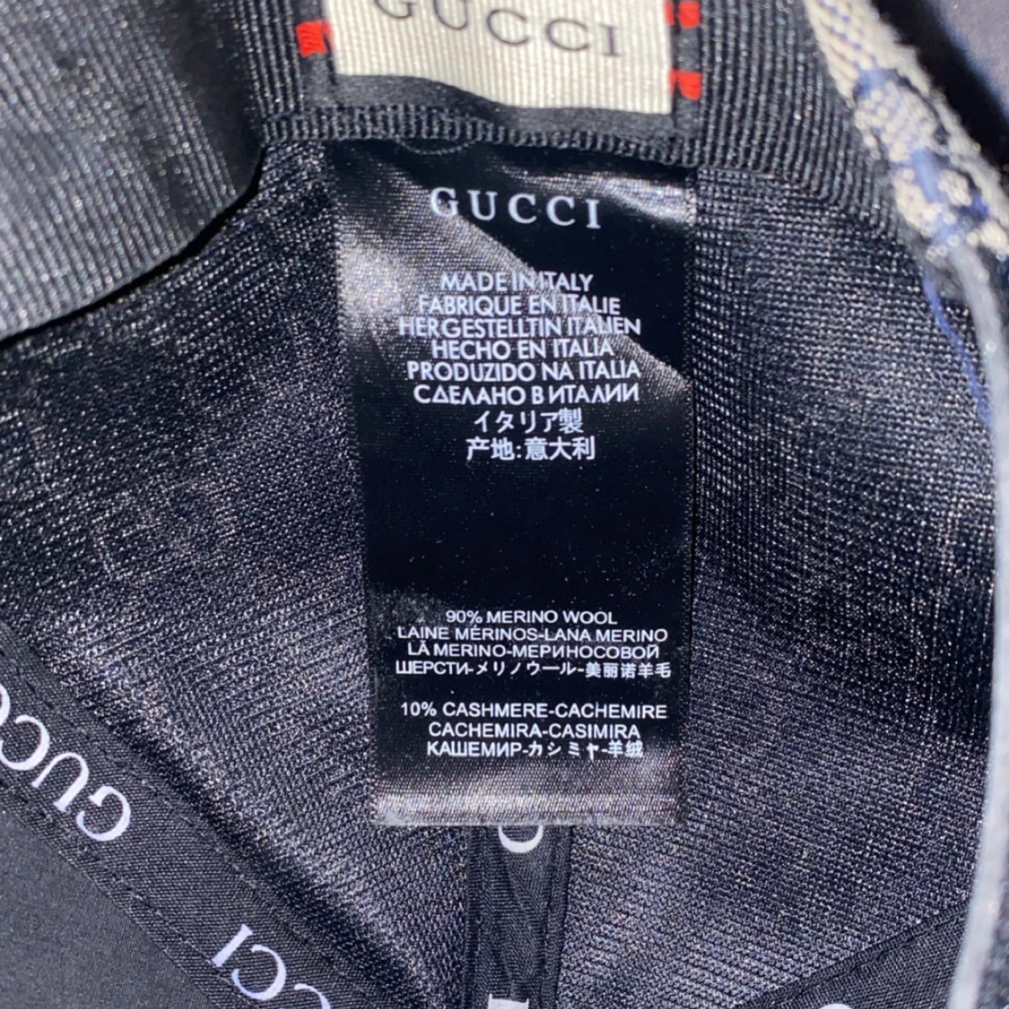 Exklusiv keps från Gucci i beige och marinblått med klassiskt GG-mönster över hela kepsen. Tillverkad i 90% merinoull och 10% kashmir. Snygga röda och gröna detaljer på sidorna. Perfekt accessoar för dig som vill sticka ut med lyxig streetstyle.