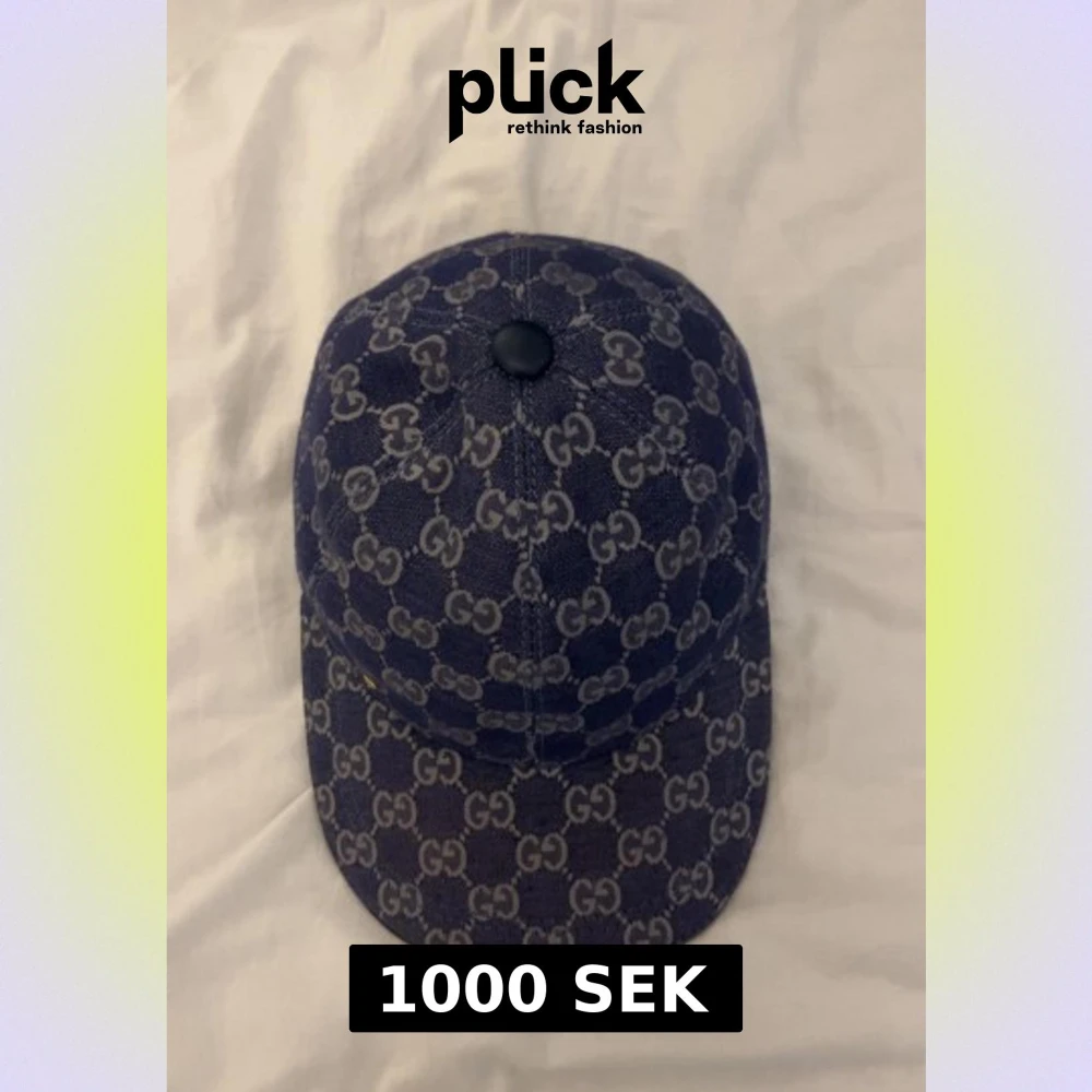 Snygg blå keps från Gucci i denimliknande tyg med klassiskt GG-mönster över hela. Justerbar rem bak i mörkblått läder med guldfärgad spänne. Svart knapp på toppen och ljus insida med etikett. Perfekt för dig som gillar lyxiga streetwear-accessoarer.