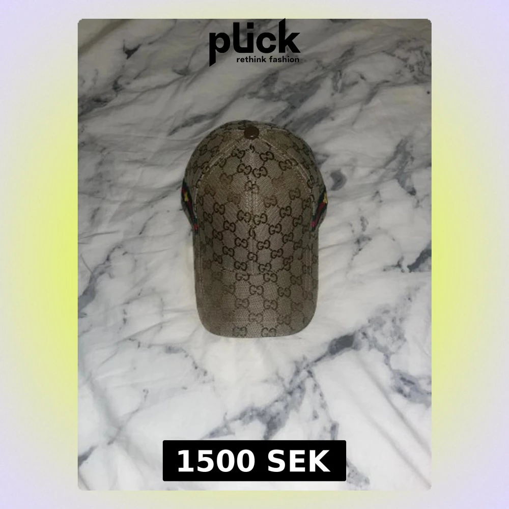 Snygg beige keps från Gucci med klassiskt GG-monogram över hela ytan. På sidan finns en broderad gul bi på en grön och röd rand. Insidan är svart med Gucci-logga på banden. Justerbar rem baktill. Materialet är canvas och bomull.