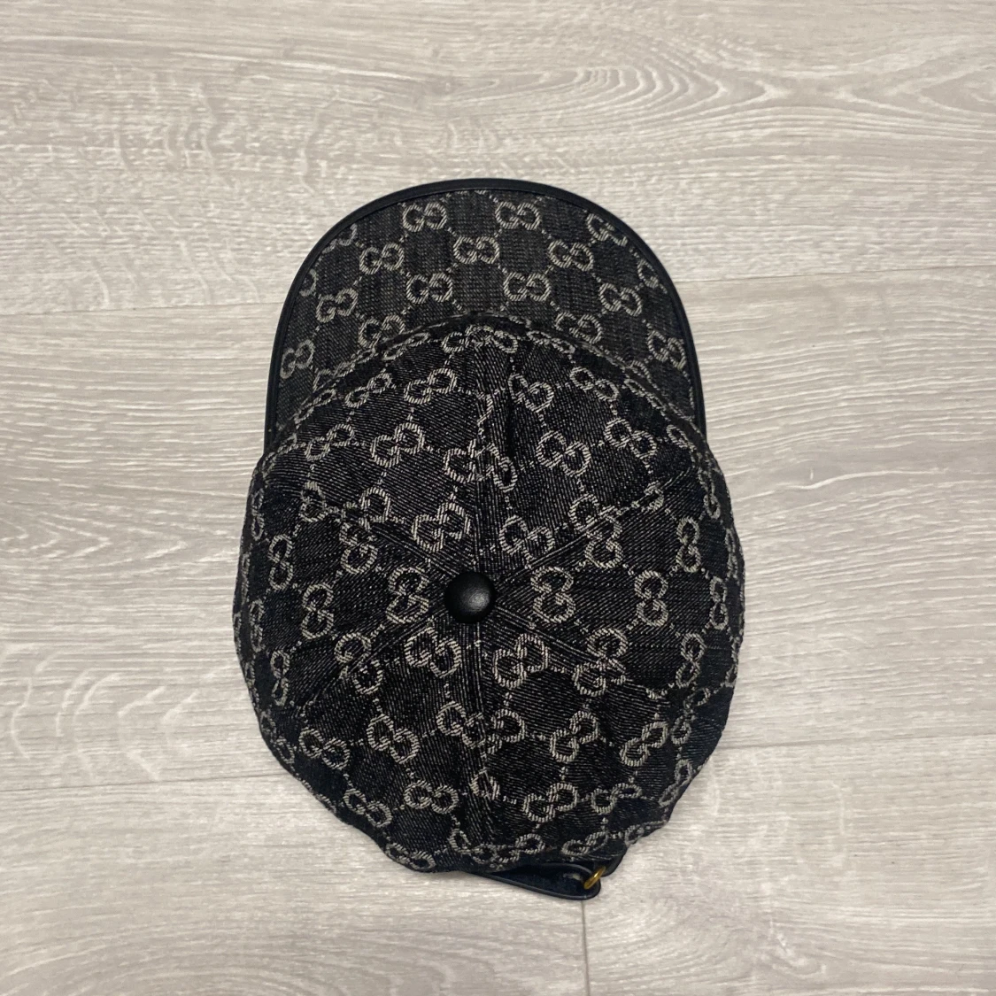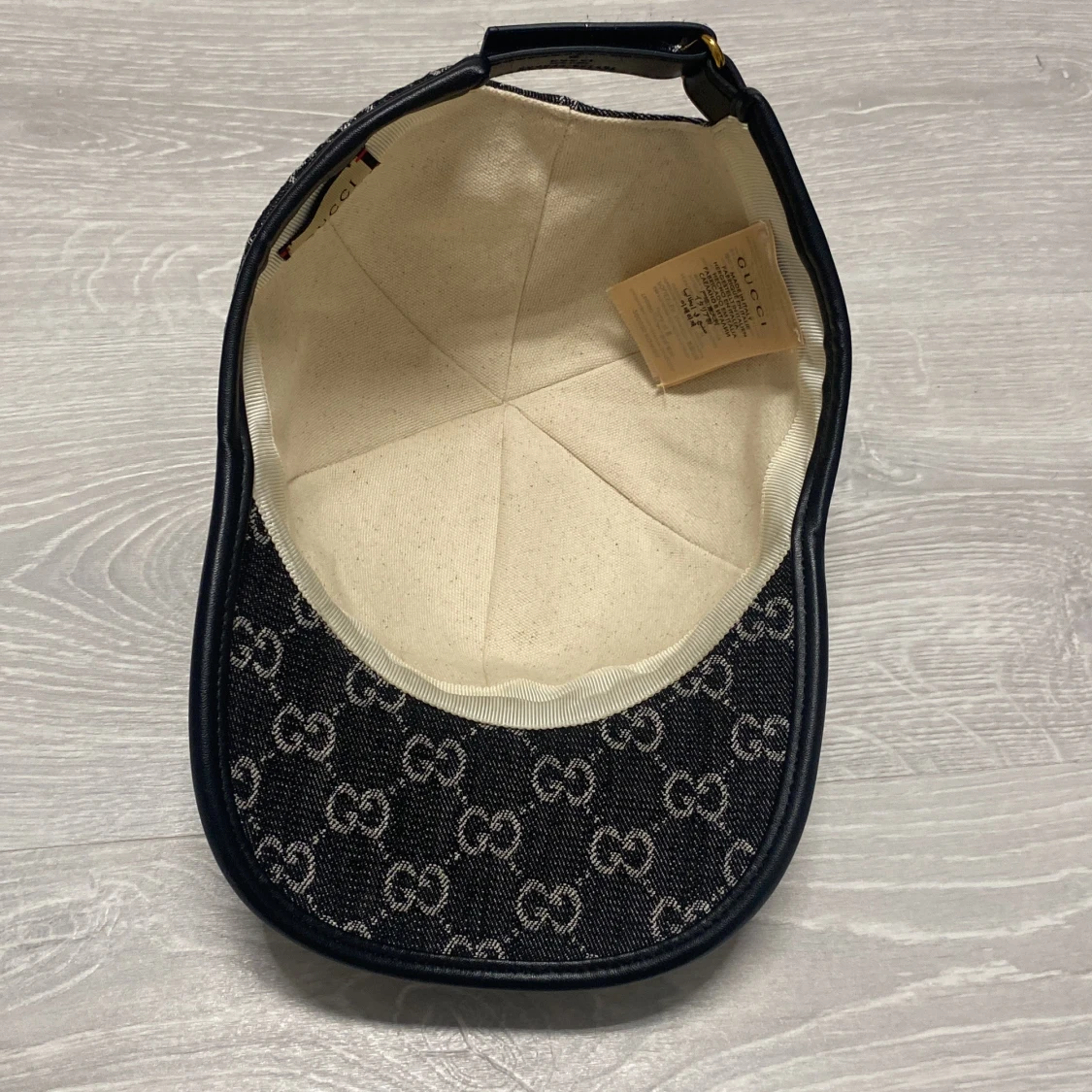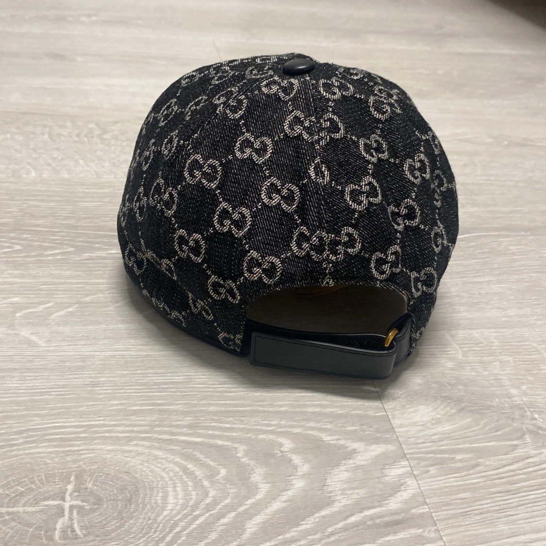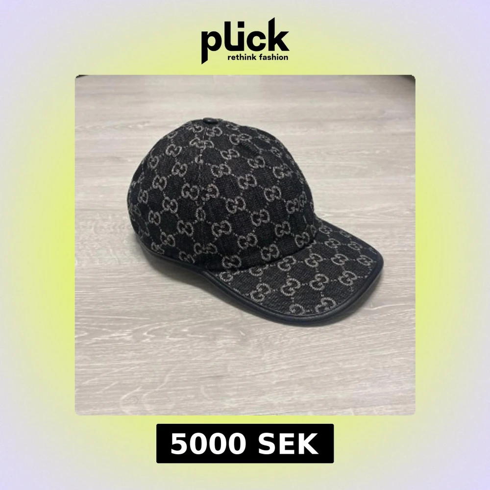 Snygg keps med klassiskt GG-mönster över hela ytan. Kepsen är tillverkad i jeansmaterial med justerbar rem bak och detaljer i svart läder. Insidan är ljus och har en etikett med Gucci-logga. Perfekt för dig som vill ha en lyxig streetstil.