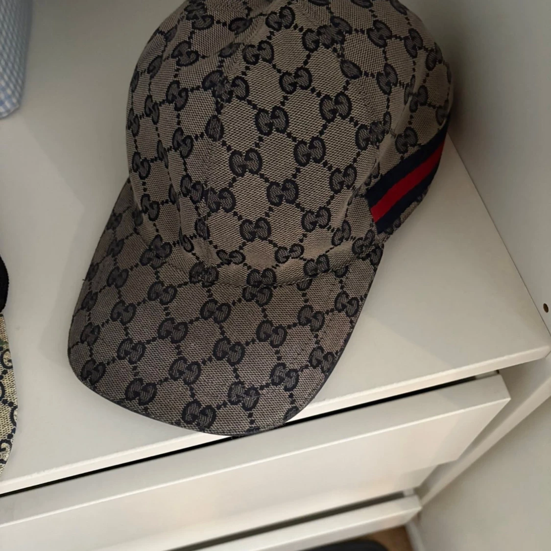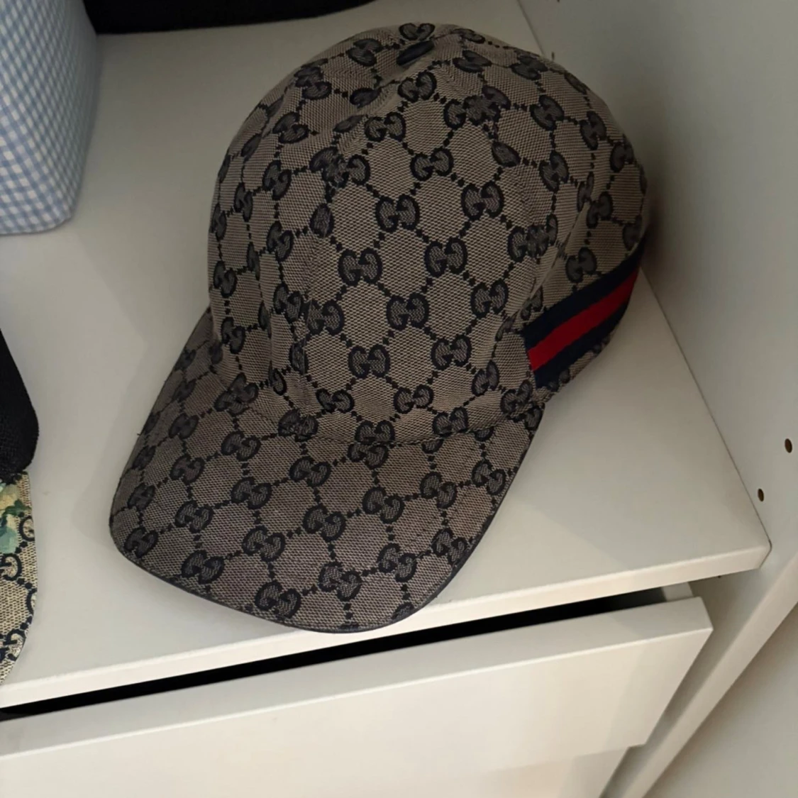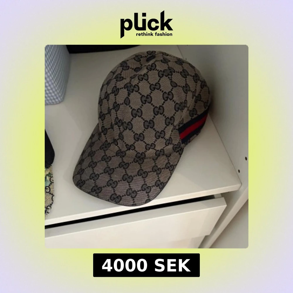 Säljer en snygg keps från Gucci med klassiskt GG-monogram i svart på beige bakgrund. Kepsen har en böjd skärm och ikoniska röd-blå ränder på sidan. Tillverkad i canvasliknande material, perfekt för dig som vill sticka ut med en lyxig accessoar.