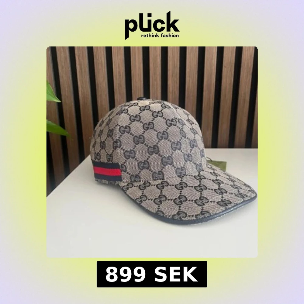 Snygg keps från Gucci i beige med klassiskt GG-monogram över hela kepsen. Kepsen har en röd och marinblå rand på sidan och justerbar rem baktill i svart läder. Tillverkad i bomullscanvas med exklusiv känsla och ikonisk design.
