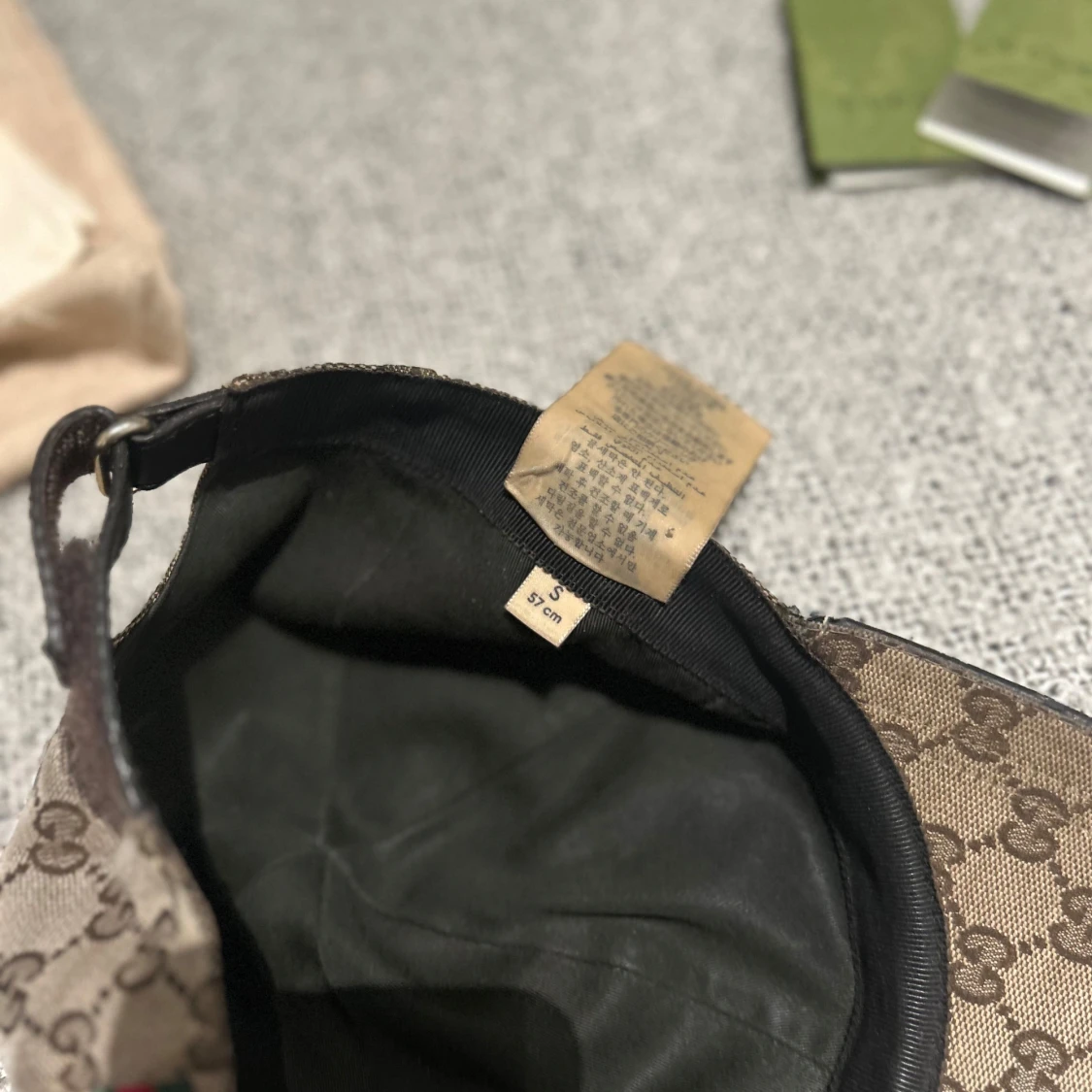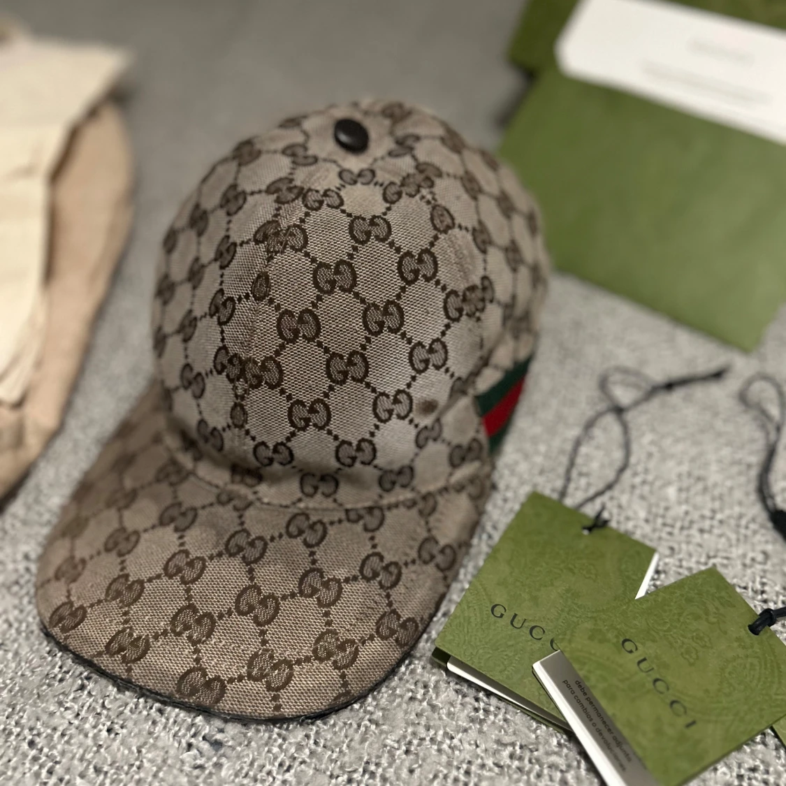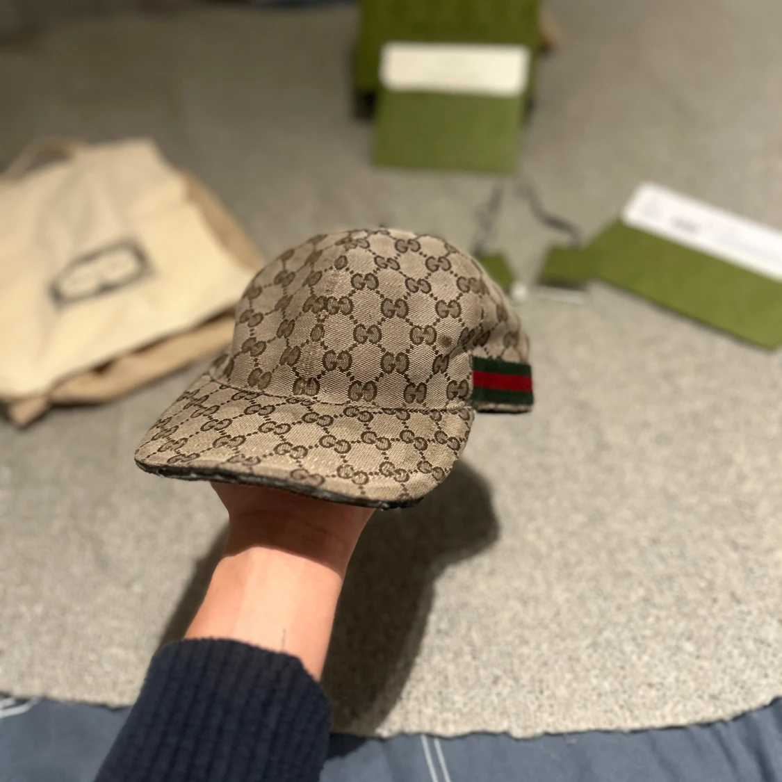 Säljer en snygg beige keps från Gucci med det klassiska GG-monogrammet över hela kepsen. Kepsen har en böjd skärm och gröna/röda ränder på sidan. Tillverkad i bomull och polyester, perfekt för dig som vill ha en lyxig streetstyle-accessoar. fås med kvitto box dustbag, med andra ord alla tillbehör. Säljer den billigt pga ganska sliten. Pris ej hugget i sten. MVH/ damskiii