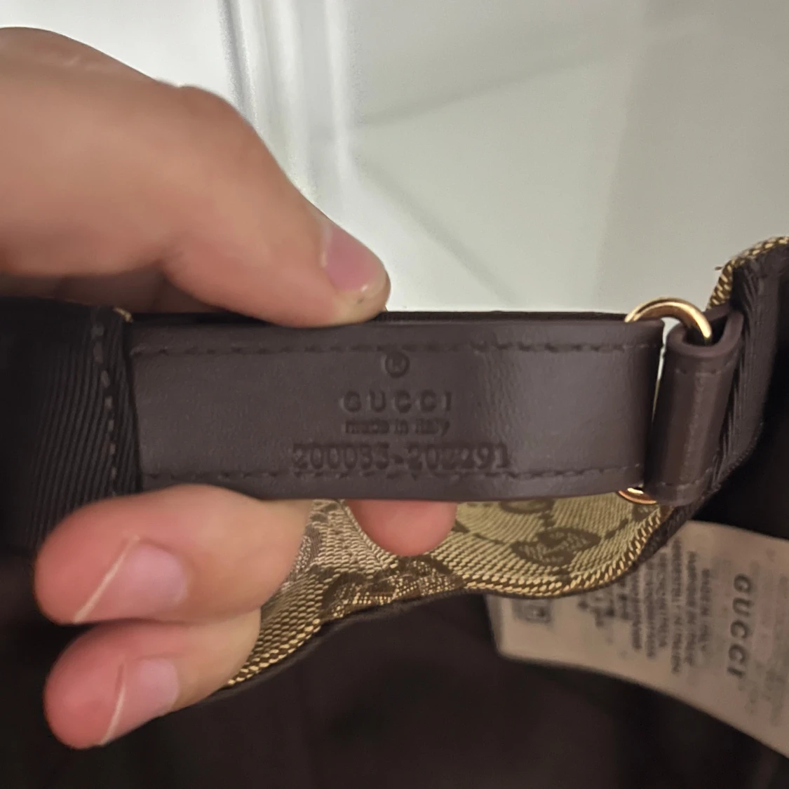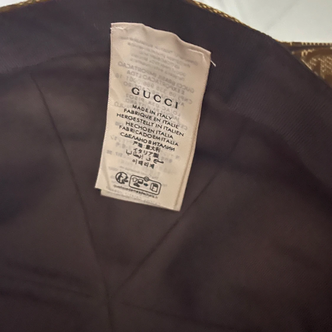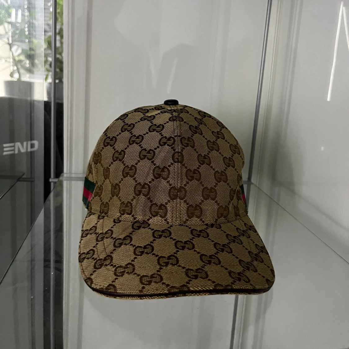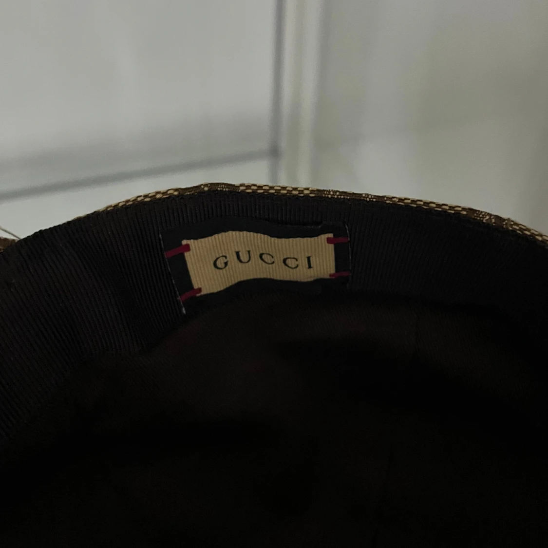 Snygg keps från Gucci i beige och brunt med klassiskt GG-monogram över hela kepsen. På sidan finns den ikoniska gröna och röda randen. Kepsen är tillverkad i bomull och polyester, perfekt för dig som vill sticka ut med en lyxig accessoar.