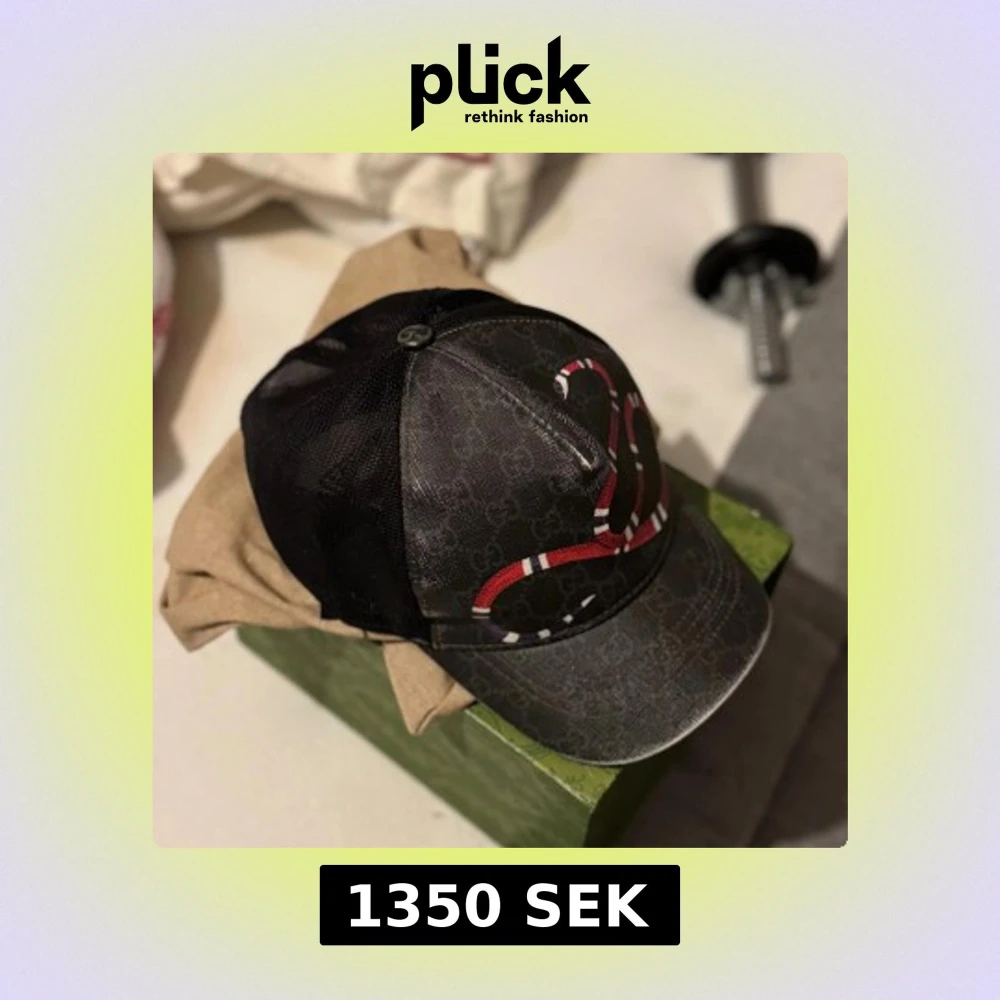 Snygg svart keps från Gucci med klassiskt GG-monogram och en stor röd, vit och svart orm på framsidan. Kepsen har mesh på sidorna och bak, vilket ger en cool och luftig känsla. Perfekt accessoar för att sticka ut i mängden.