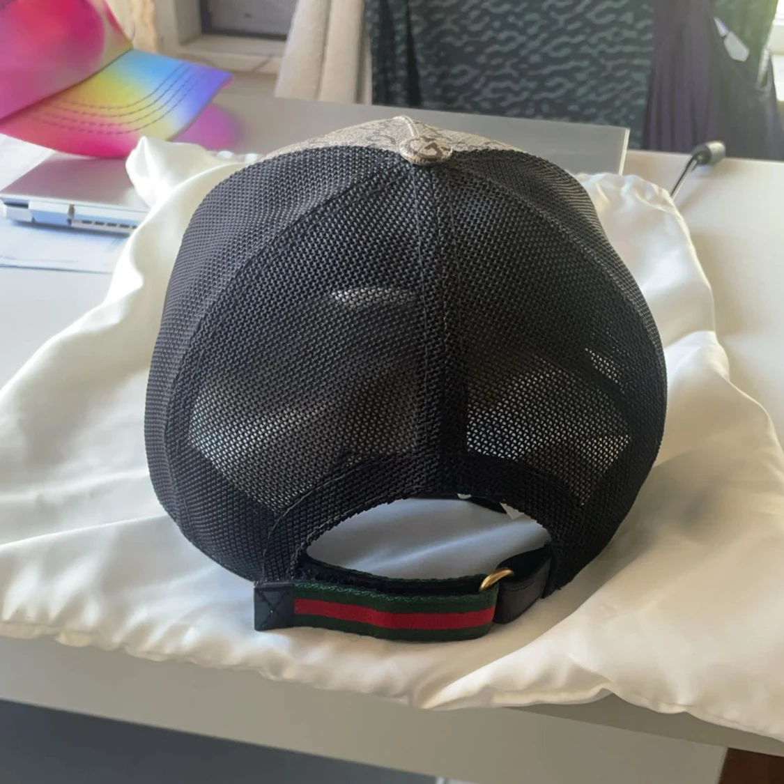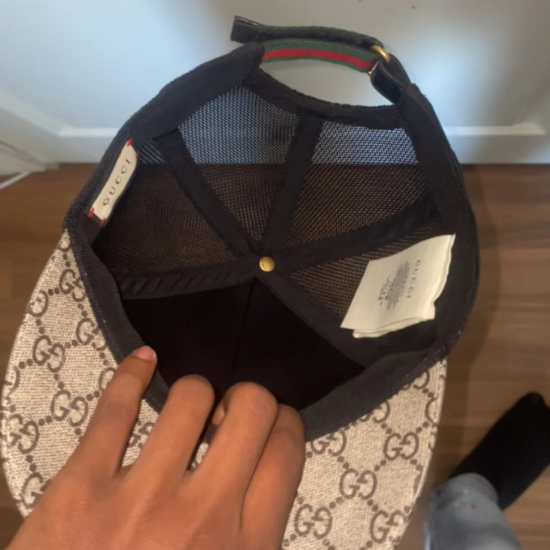 Säljer en limited edition kingsnake keps från Gucci som ej SÄLJS LÄNGRE med klassiskt GG-mönster i beige och brunt, prydd med en röd orm framtill. Baksidan är i svart mesh och justerbar med grön-röd randig rem. Perfekt för dig som vill sticka ut med en lyxig accessoar.